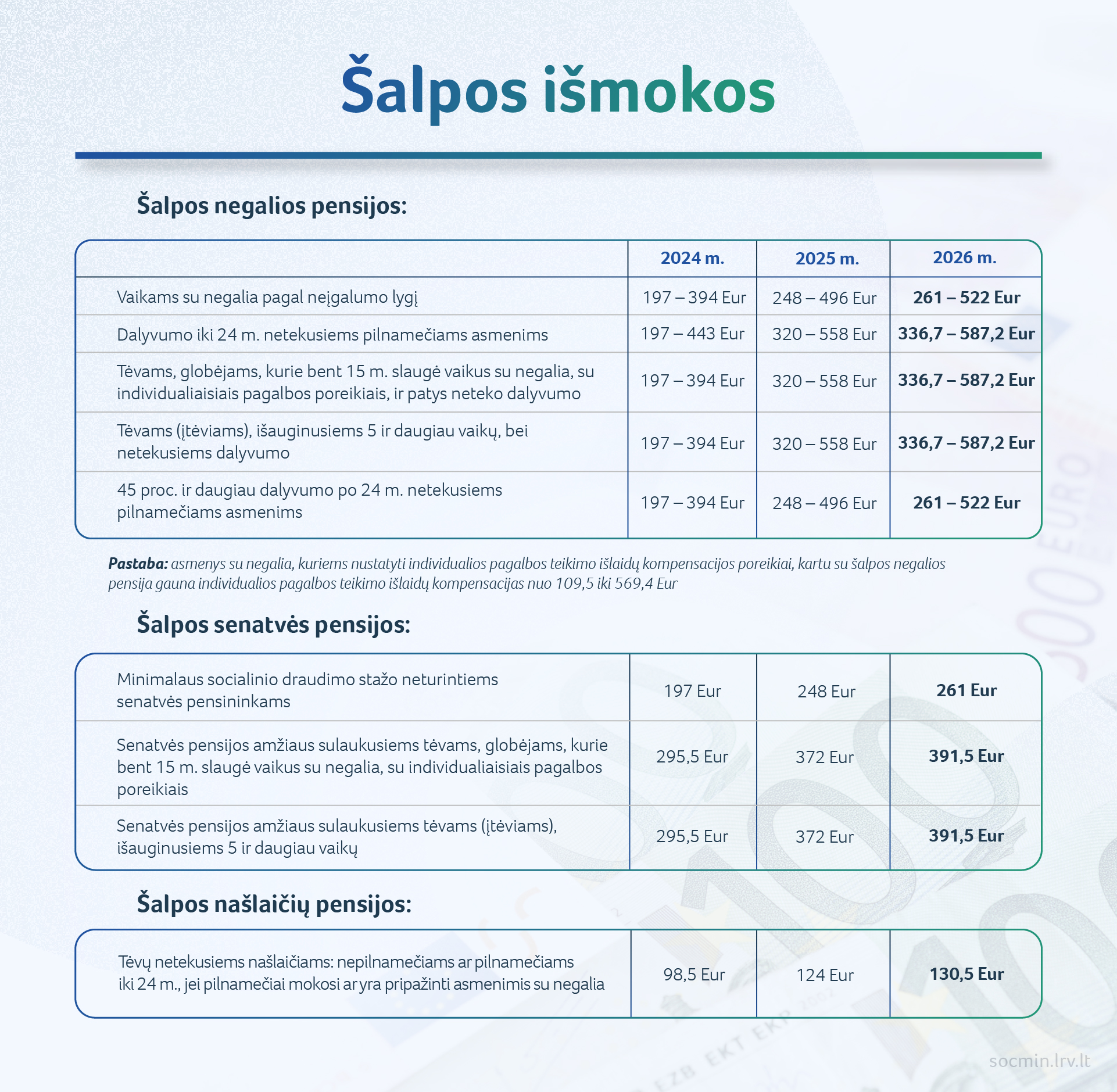 ŠALPOS PENSIJŲ BAZĖS DYDIS. Nuo 2026 m. sausio 1 d. šalpos pensijų bazė didės iki 261 euro.