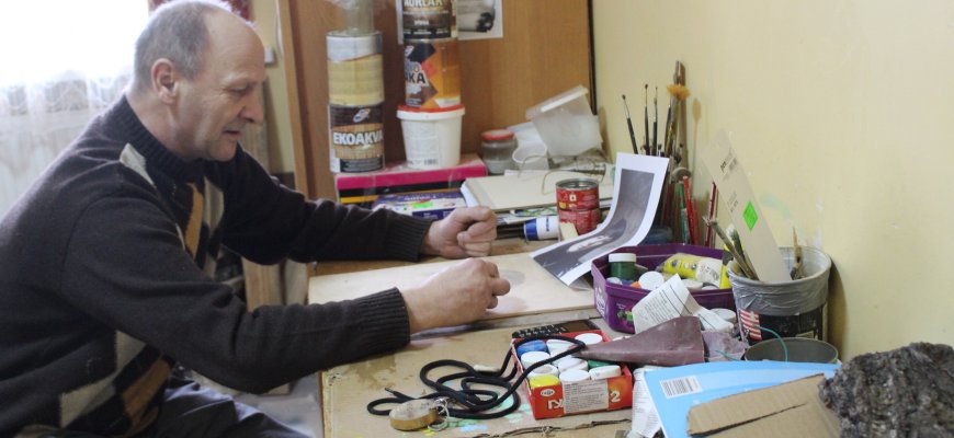 Dabar jis ištisas dienas leidžia kūrybinėse dirbtuvėlėse. Jose apstu visko, ko reikia kūrybai: ir dailiai supjaustyti beržo ritinėliai. Jie skirti būsimiesiems paveikslams. Čia pat ištisos paletės įvairiausių dažų, klijų indeliai, gamtos turtų – samanų, kankorėžių, tošių atsargos.