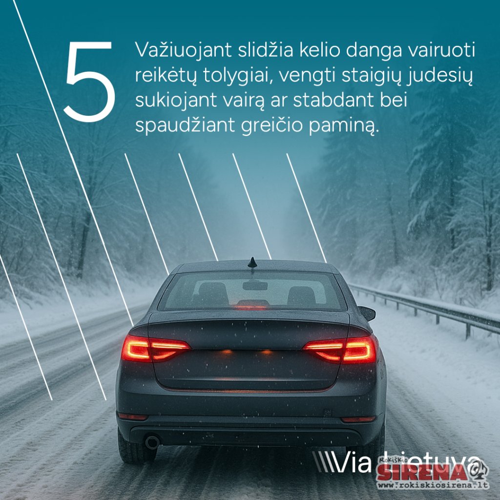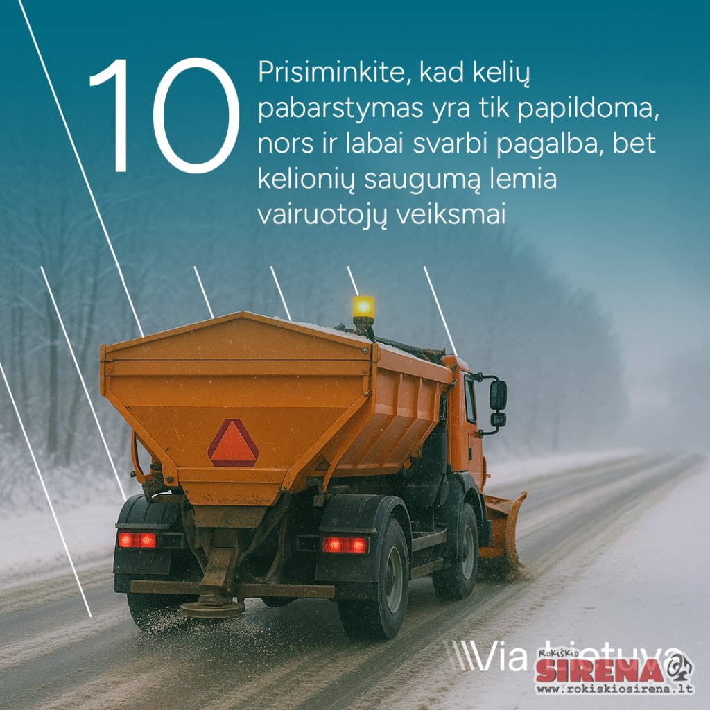 Žiemą pasikeičia vairavimo sąlygos, todėl, prieš pradedant kelionę šiuo metų laiku, būtina nustatyti kelio dangos būklę, patikrinti ir patiems įsivertinti, koks yra padangų sukibimas su kelio danga, t. y. važiuojant paspausti stabdžius, žinoma, įsitikinus, kad tai daryti saugu. Vairuotojai turėtų atsiminti, kad kelių pabarstymas yra tik papildoma, nors ir labai svarbi, pagalba. Vis dėlto kelionių saugumą lemia vairuotojų veiksmai.