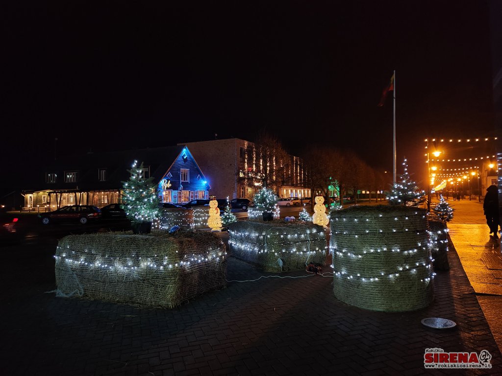Nors prieš gerą mėnesį miesto puošybos klausimu kalbintas Rokiškio rajono savivaldybės administracijos direktorius Valerijus Rancevas su šypsena apie šį darbą sakė, kad specialistams „prasidėjo kūrybinės kančios“, visgi tų „kančių“ rezultatas šiemet rokiškėnus nustebino gerąja prasme. Šeštadienį į šventę susibūrę miestelėnai džiaugėsi, jog pagaliau, po ilgų metų pertraukos, aikštėje švenčių laukianti eglė – nebe vieniša: jai draugiją palaiko 10 šviečiančių besmegenių, išsislapsčiusių tarp žaismingai išdėliotų šieno rulonų ir kitkų. Lyg diskotekos salė šiais metais ir pati aikštė – kiekvienas čia esantis pastatas apšviestas spalvingomis lempomis, kurių puošyba besirūpinantys specialistai iš viso sukabino daugiau nei penkias dešimtis.