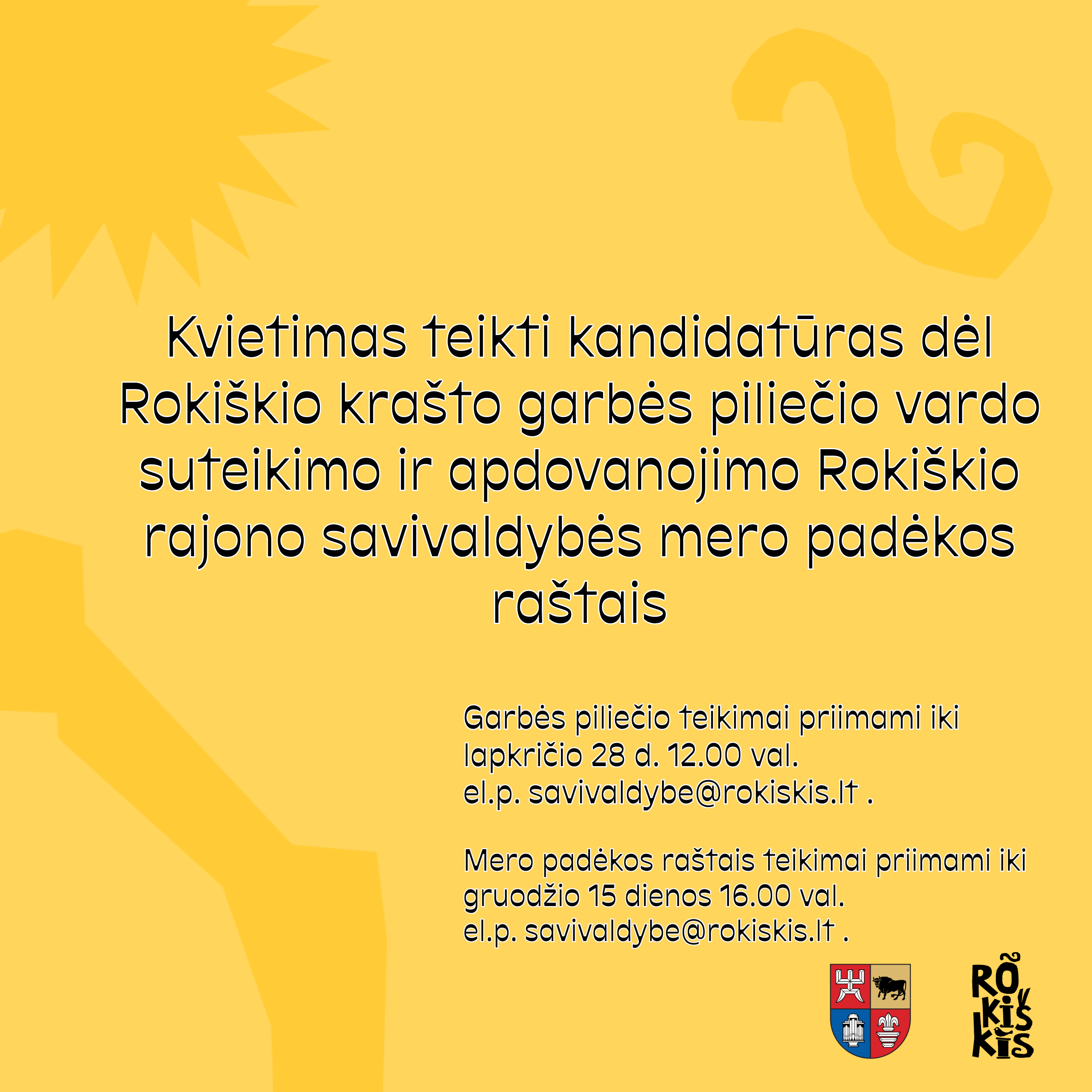 Kitame rajono savivaldybės kvietime rokiškėnų įžvalgos jau yra būtinos: iki mėnesio pabaigos – lapkričio 28 d., savivaldybės specialistai laukia pretendentų Rokiškio krašto garbės piliečio vardui gauti. Kandidatų teikimai priimami iki lapkričio 28 dienos 12 val. el. p. savivaldybe@rokiskis.lt.