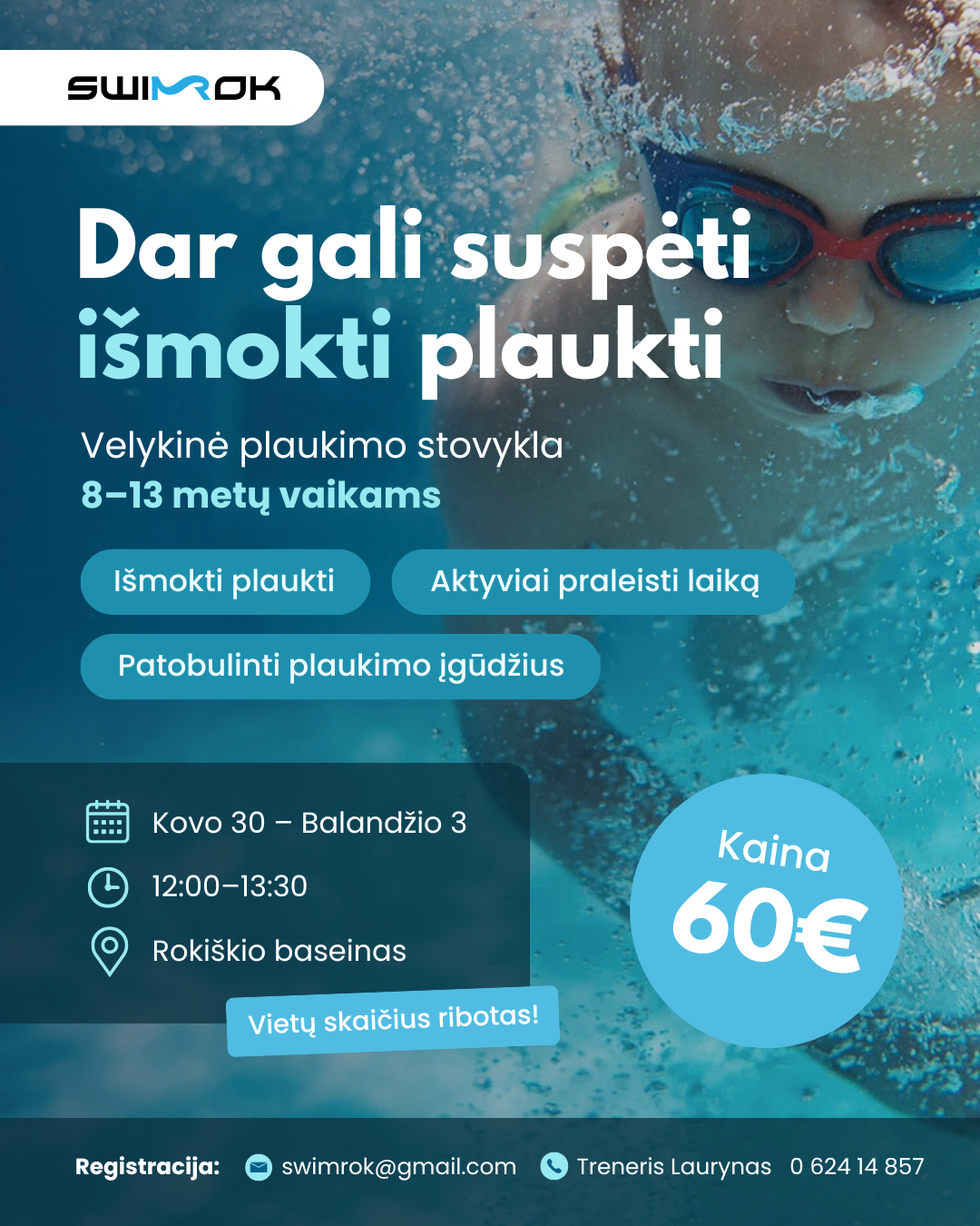 Plaukimo klubas „SwimRok“ per pavasario atostogas organizuoja Velykinę plaukimo stovyklą vaikams Rokiškio baseine.