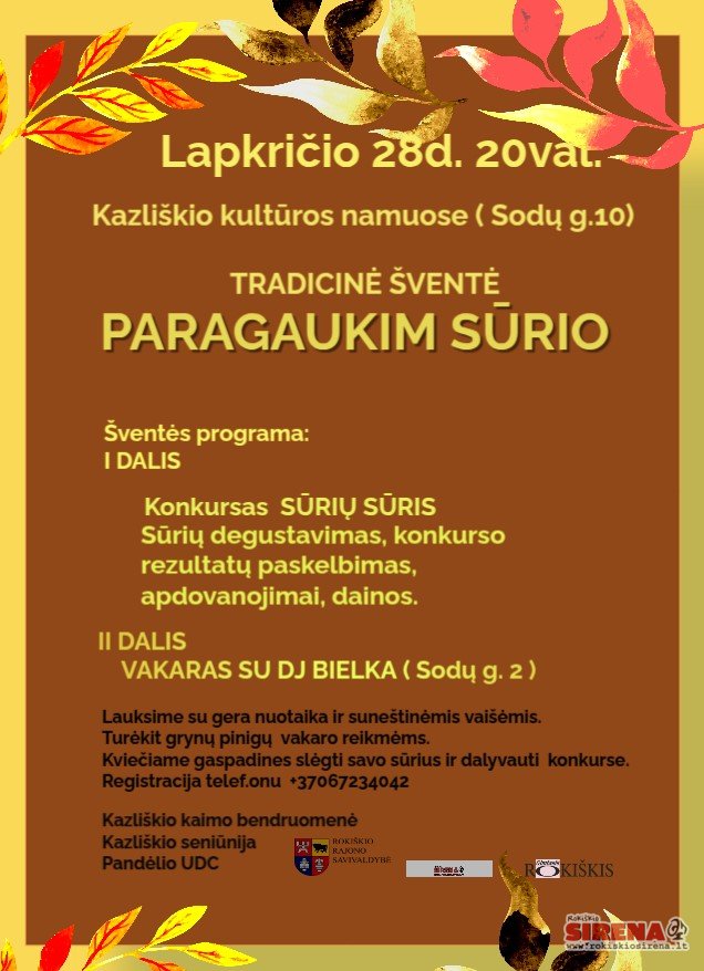Lapkričio 28 d. 20 val. Kazliškyje vyks jau tradicija tapusi šventė „Paragaukim sūrio“, kviečianti visus sūrių mėgėjus, smalsuolius ir linksmų vakarų išsiilgusius žmones susiburti Kazliškio kultūros namuose (Sodų g. 10).
