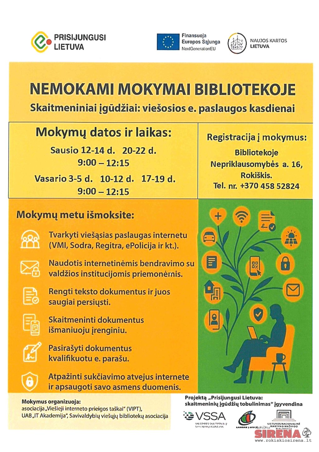 Sausio 20-22 d. 9-12.15 val. – Nemokami kompiuterinio raštingumo mokymai „Skaitmeniniai įgūdžiai: viešosios e. paslaugos kasdienai“. Registracija telefonu: +370 458 52824.