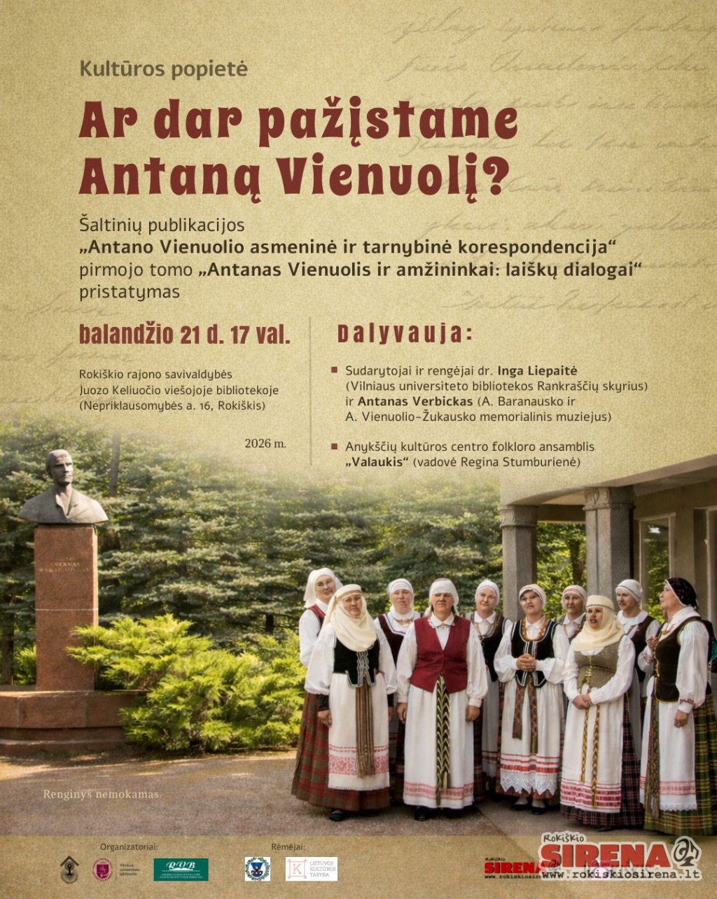 Balandžio 21 d. 17 val. – Knygos „Antano Vienuolio asmeninė ir tarnybinė korespondencija“ pristatymas.