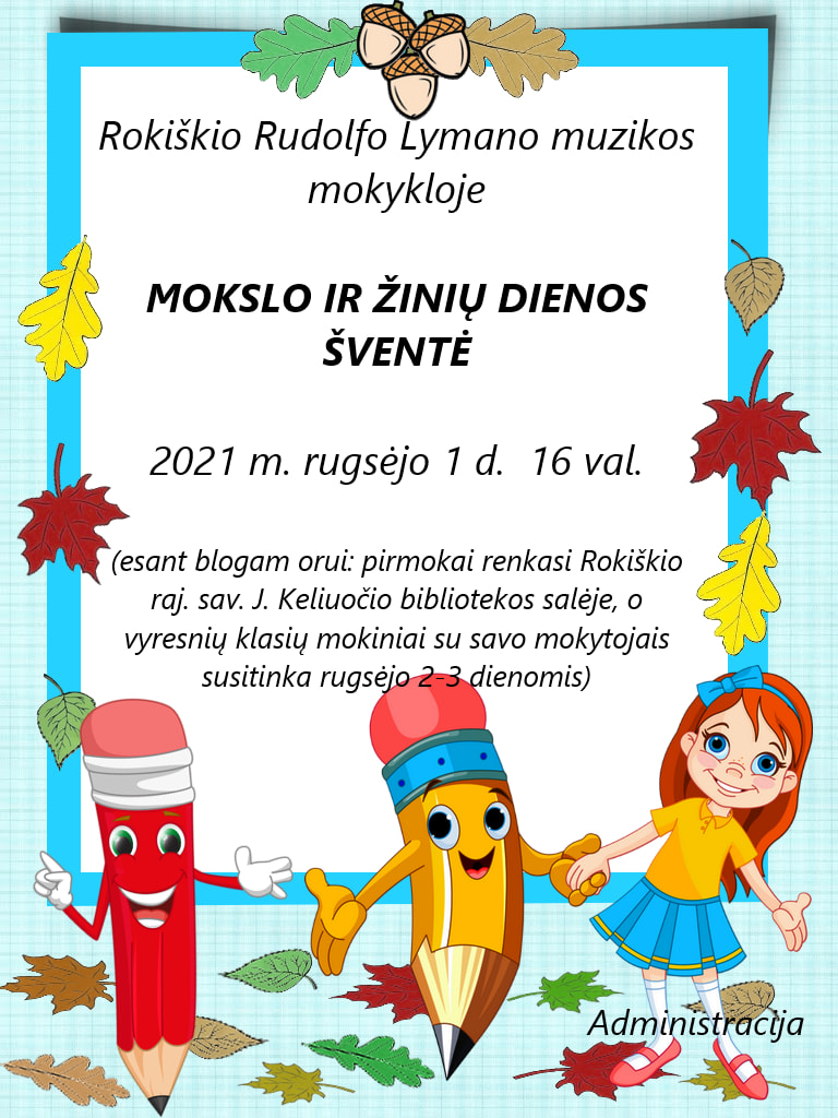 Mokslo metų pradžios šventė Rokiškio Rudolfo Lymano muzikos mokyklos choreografijos skyriuje vyks rugsėjo 1 d. 14 val. Sąjūdžio aikštėje Respublikos g. 96 prie Choreografijos mokyklos (skyriaus).