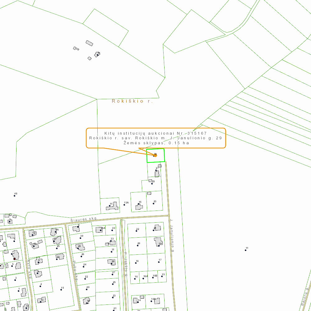 Aukcione parduodamas valstybinės žemės sklypas gyvenamųjų namų statybai, esantis J. Janulionio g. 29, Rokiškio m., kitos paskirties, naudojimo būdas – vienbučių ir dvibučių gyvenamųjų pastatų teritorijos (0.15 ha).