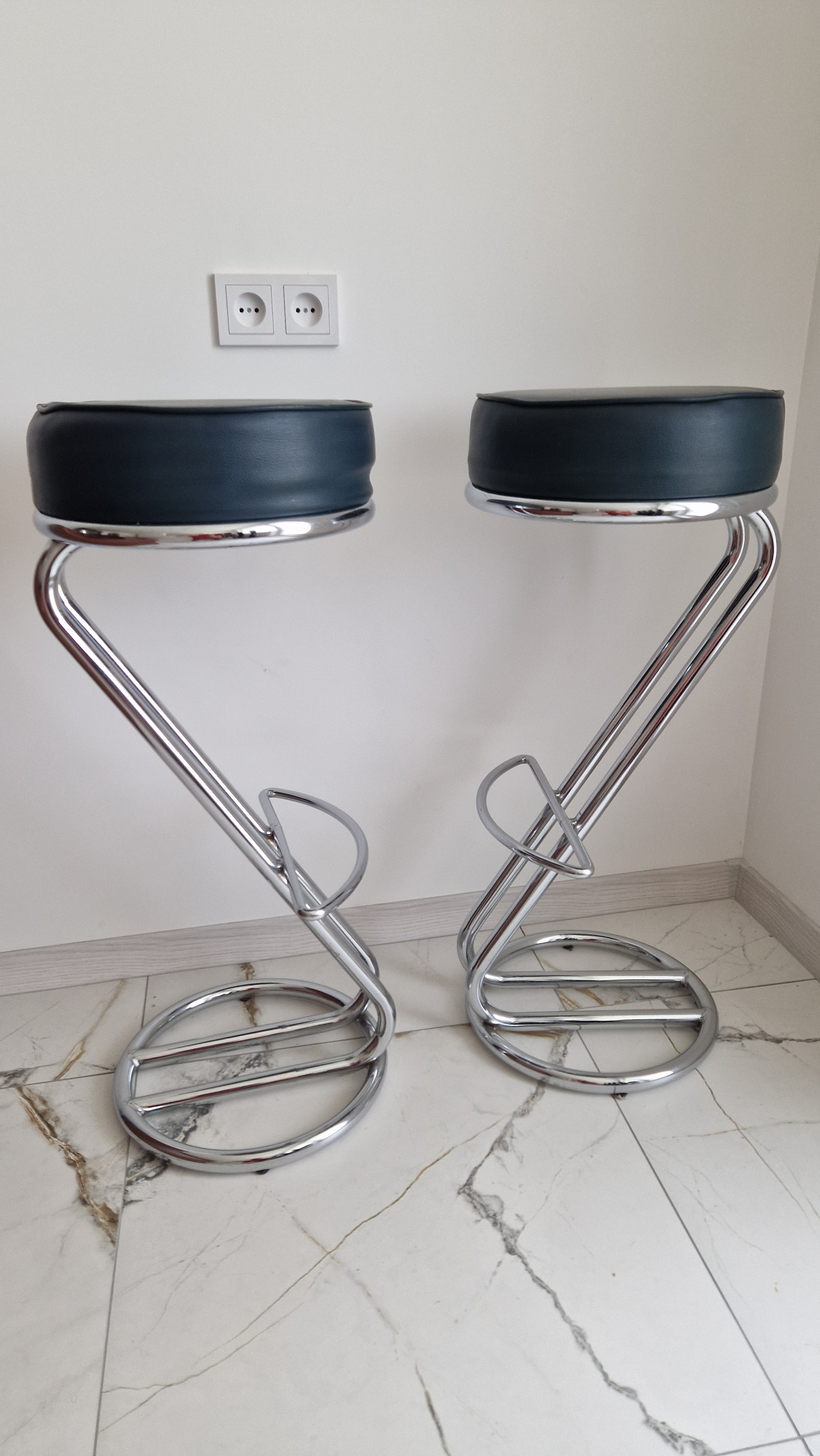 Mažai naudotas, tamsiai žalios spalvos baro kėdes. 2 vnt. Tvirtas metalinis baro kėdės rėmas dengtas chromu. Pakojis patogiai kojų atramai, aukštis 84 cm, plotis 35 cm. Yra ir baro stalviršis
