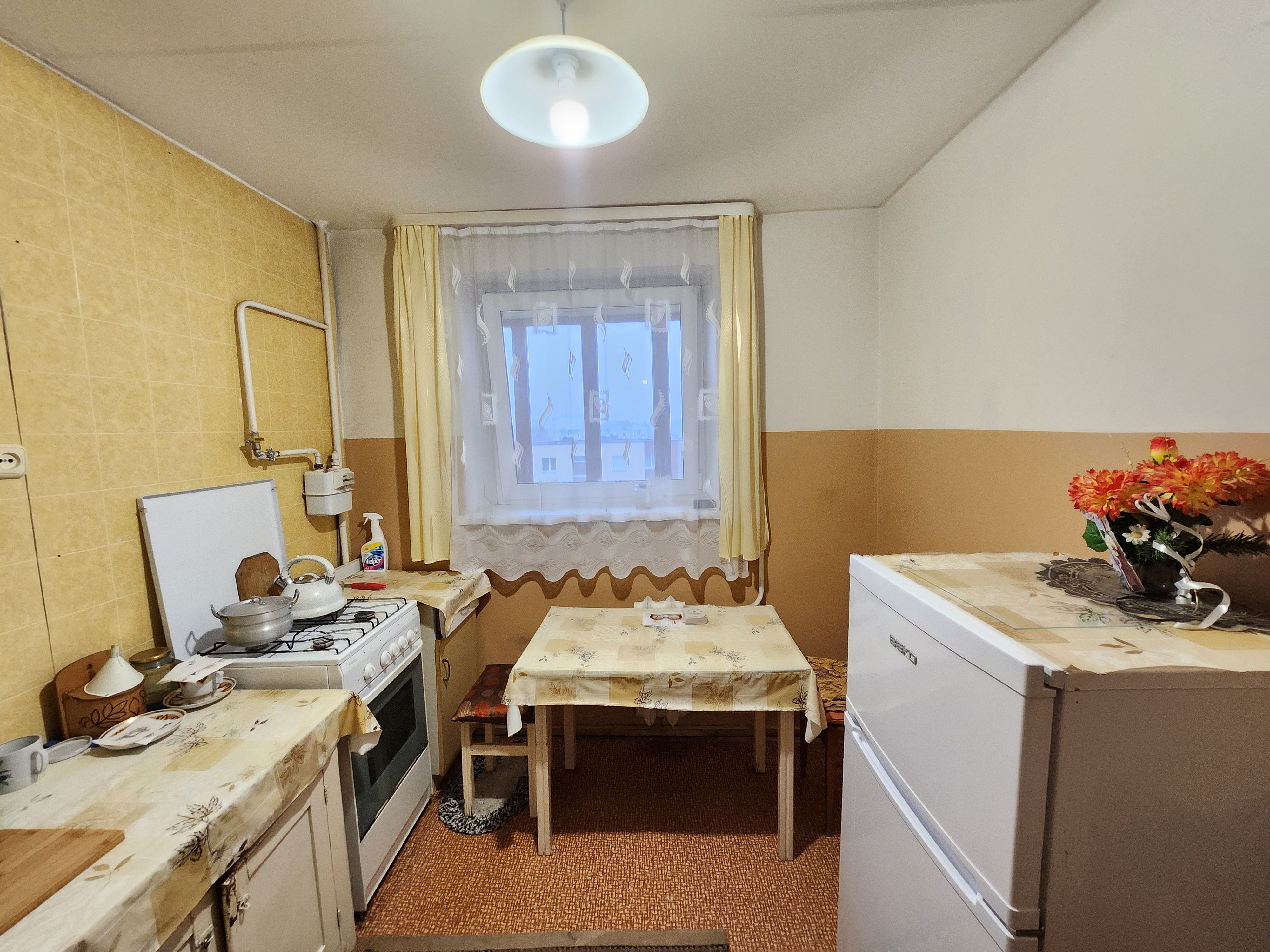 Erdvų 1 kambario butą su balkonu Rokiškyje. Šarvo durys, tamsus kambariukas, 6 aukštas. Langai ne į gatvės pusę