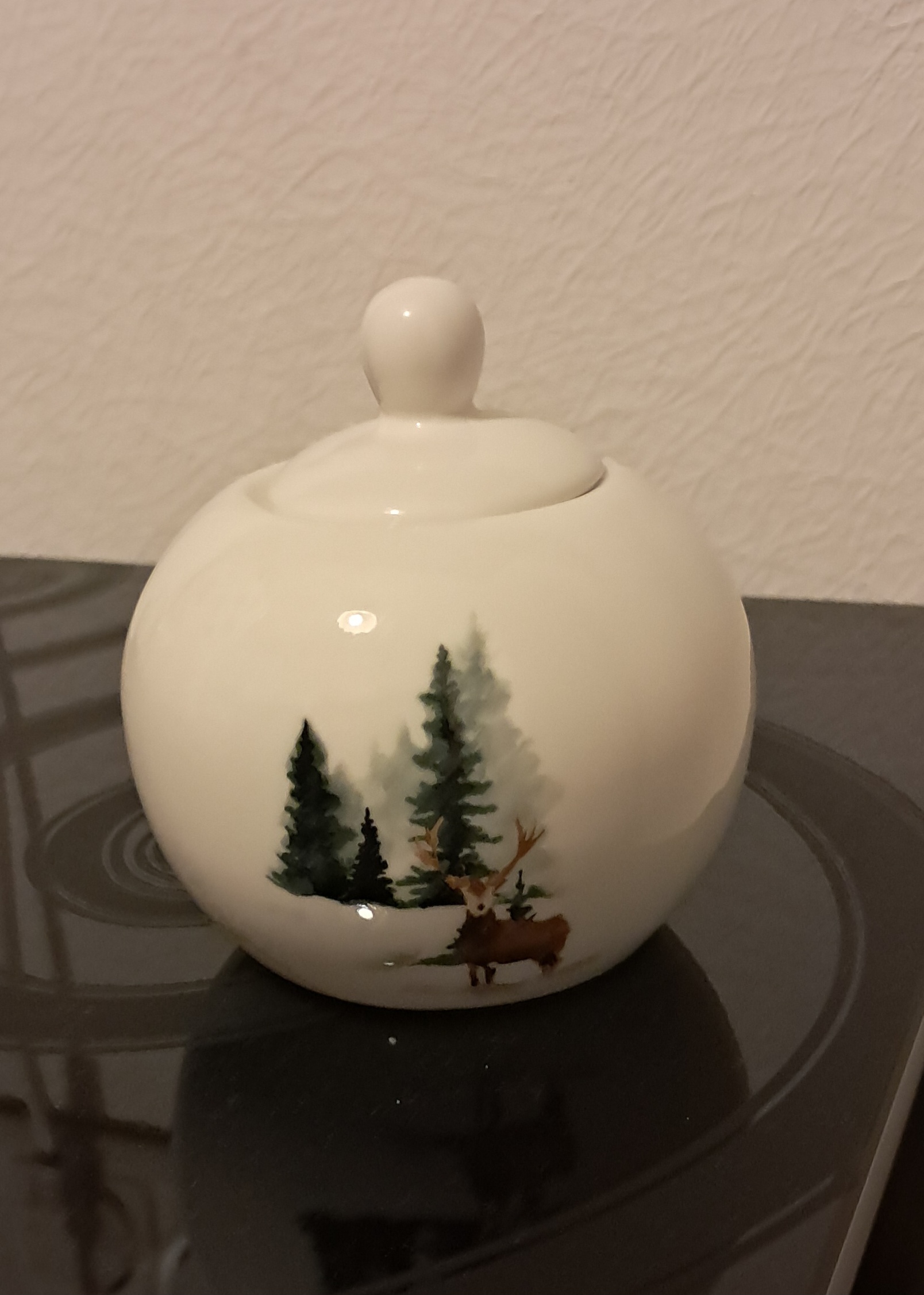 Apvalios formos indą su miško ir elnio motyvu, kurį galima naudoti ir kaip cukrinę. Naujas