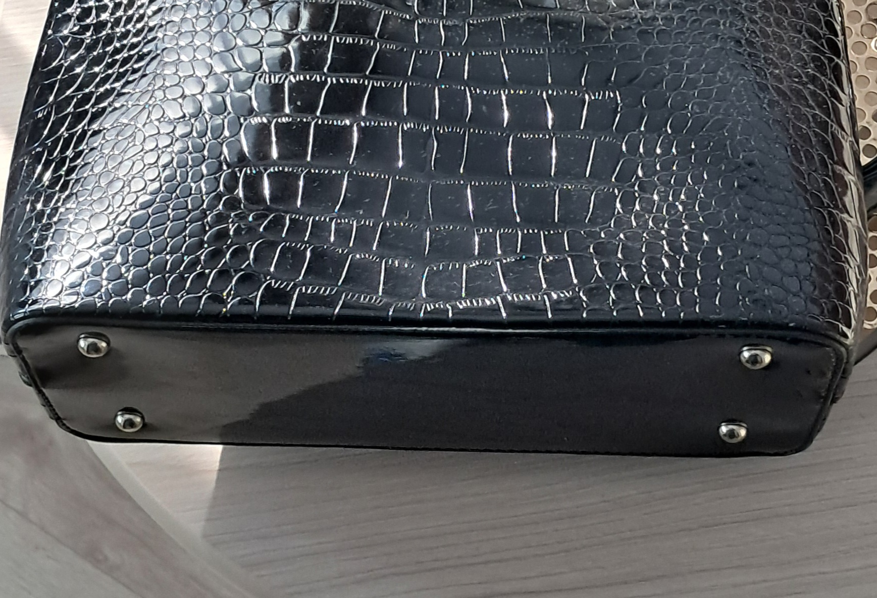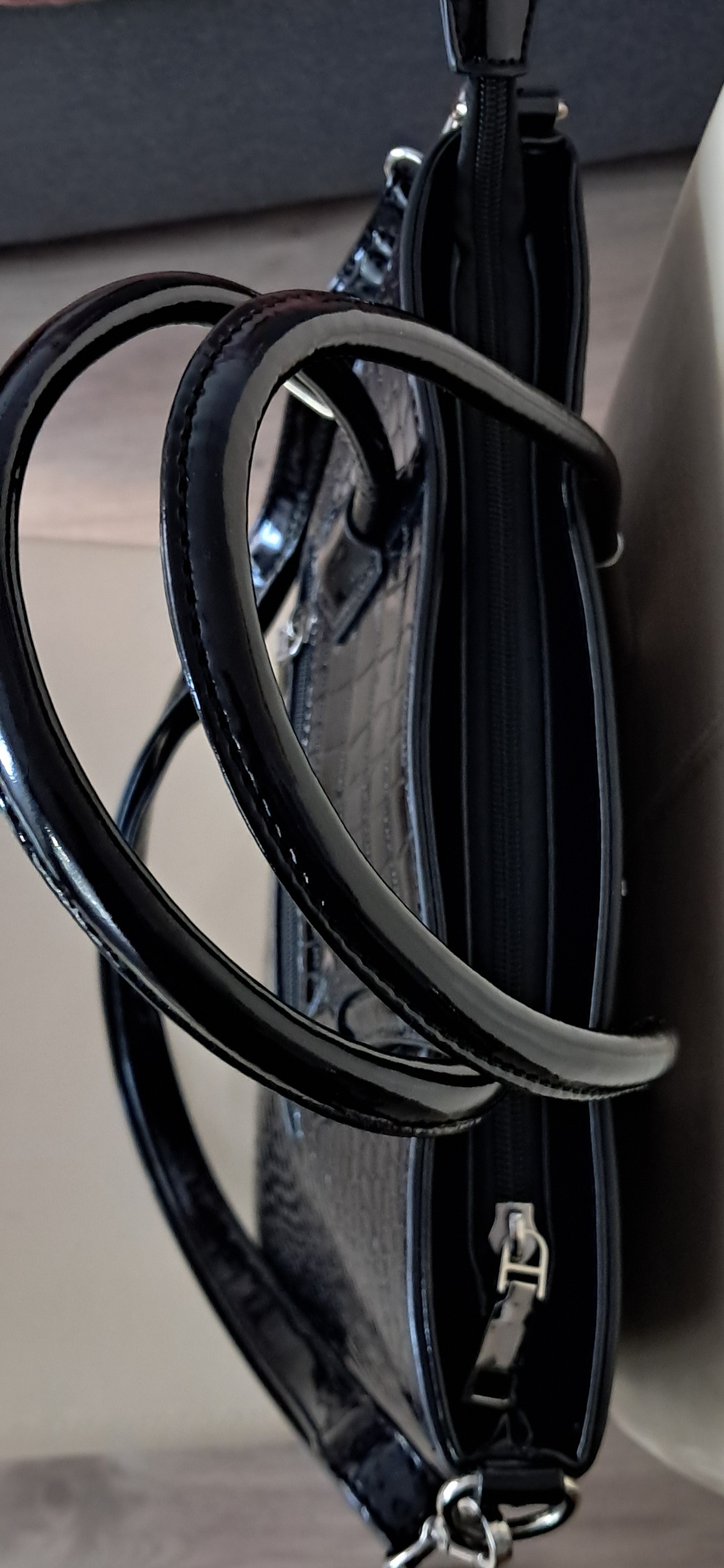 Blizgią, krokodilo odos imitacijos rankinę. Viduje skyrius su užtrauktuku, kišenėlės