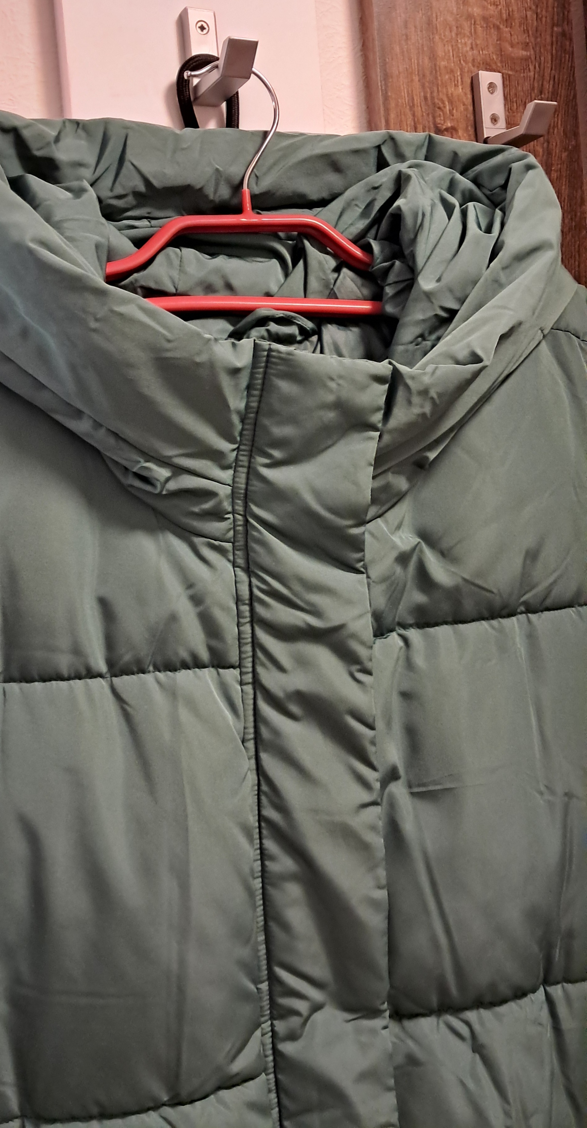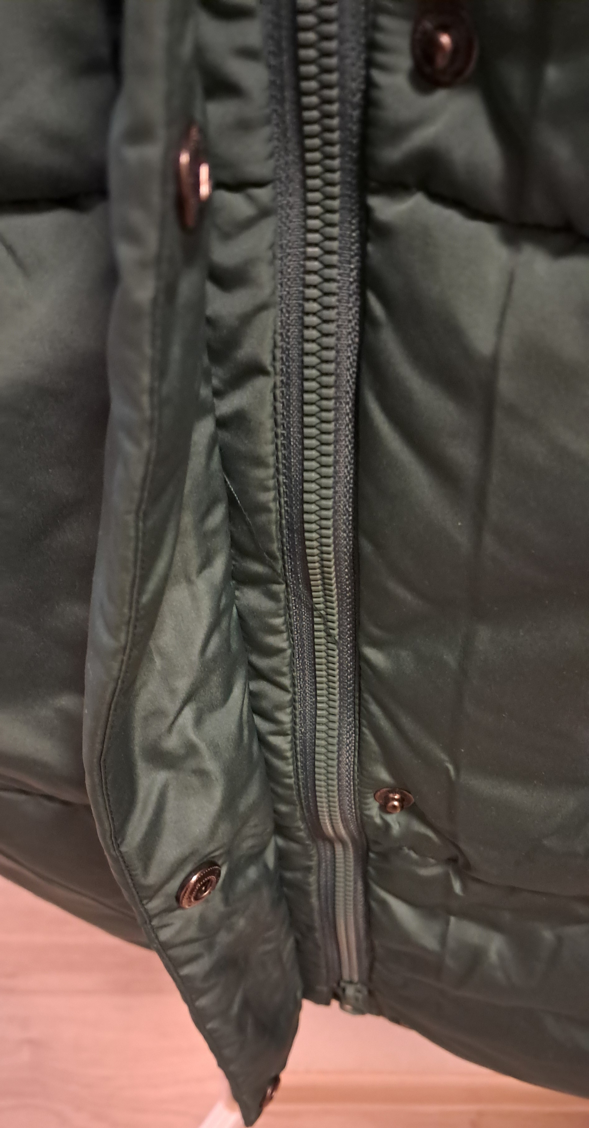 Žalios spalvos striukę su gobtuvu, vidutinio storio (nuotraukoje išėjo lyg išblukusi spalva). Dydis XL (atitinka 42 dydį). Ilgis truputį žemiau kelių