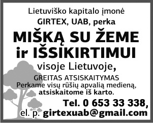 Lietuviško kapitalo įmonė UAB Girtex perka mišką su žeme ir išsikirtimui visoje Lietuvoje.Greitas atsiskaitymas.Perkame visų rūšių apvalią medieną, atsiskaitome iš karto.