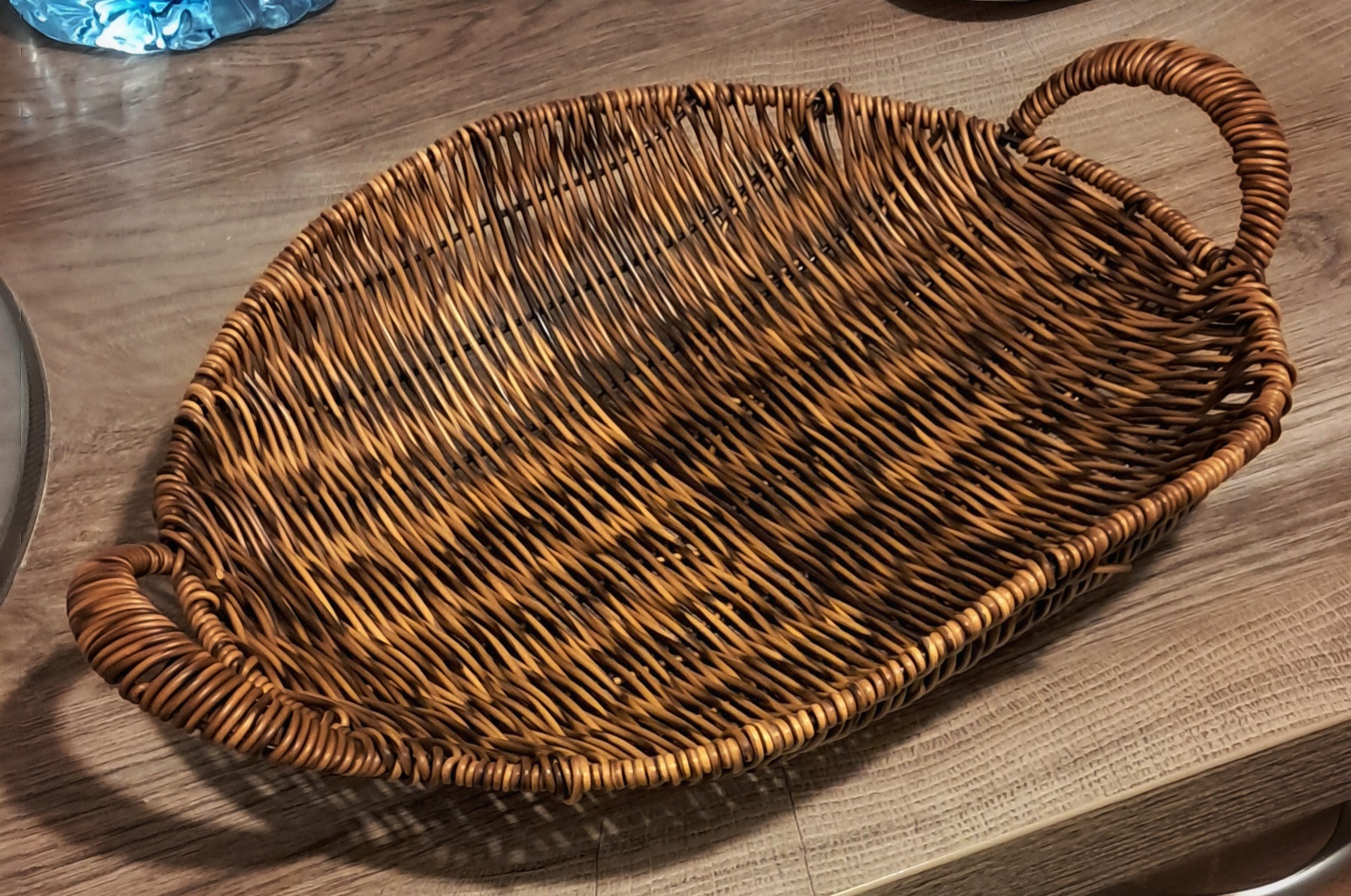 Naują, kokybiškai padarytą, ne tik naudingą pagal paskirtį (sudėti vaisiams, Velykų margučiams ir pan.), bet puošiančią stalą pintą lėkštę. Išmatavimai 40×28 cm