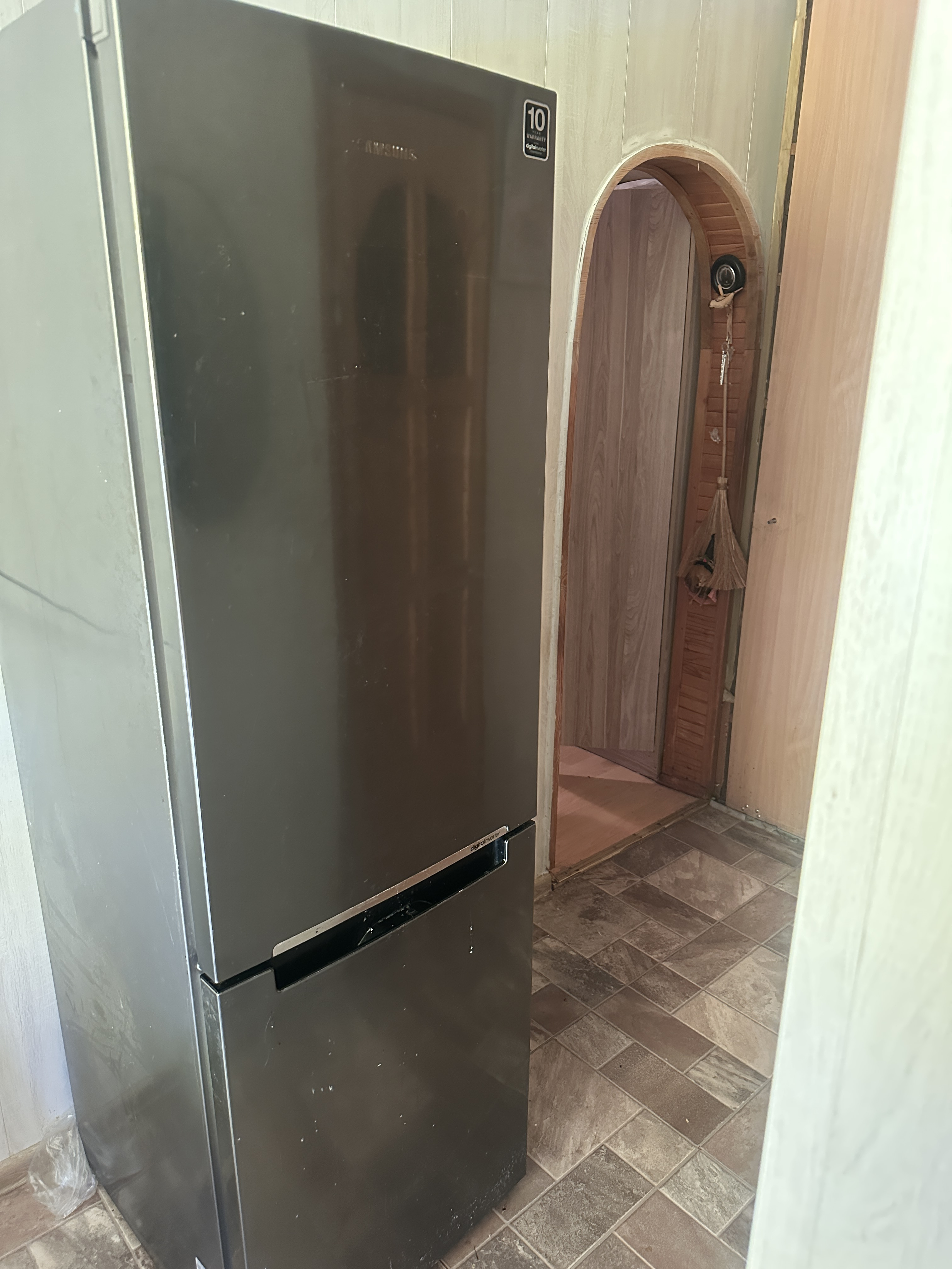 „Samsung“ šaldytuvą (aukštis ~185 cm, plotis ~60 cm). • Būklė: Veikiantis. • Technologija: „No Frost“ (nereikia atitirpinti)