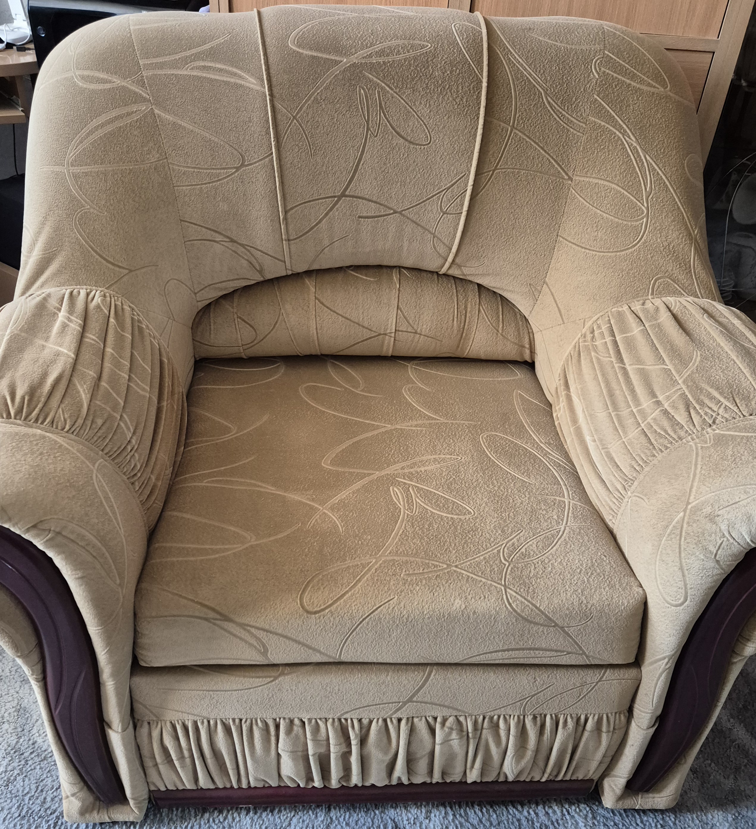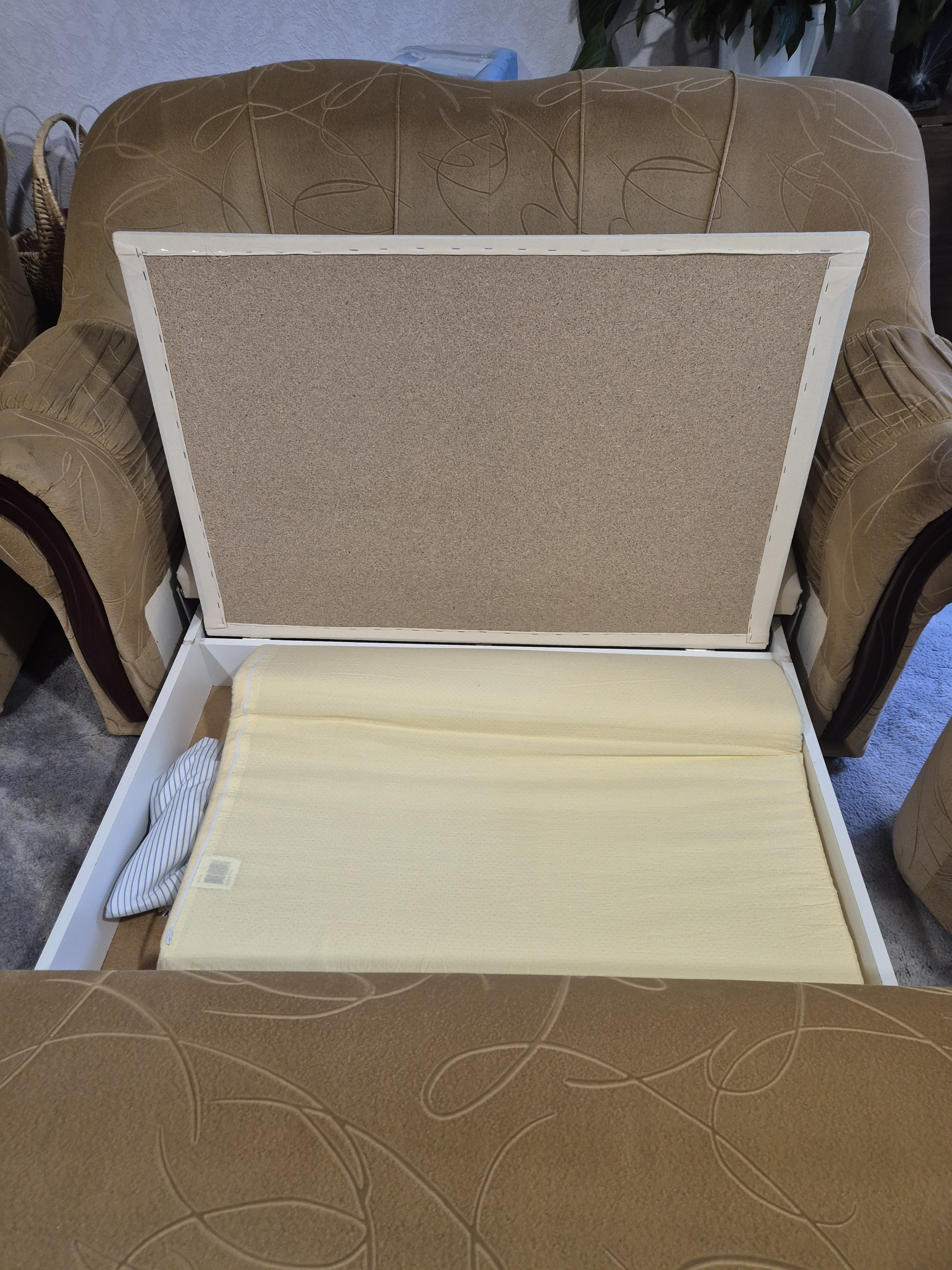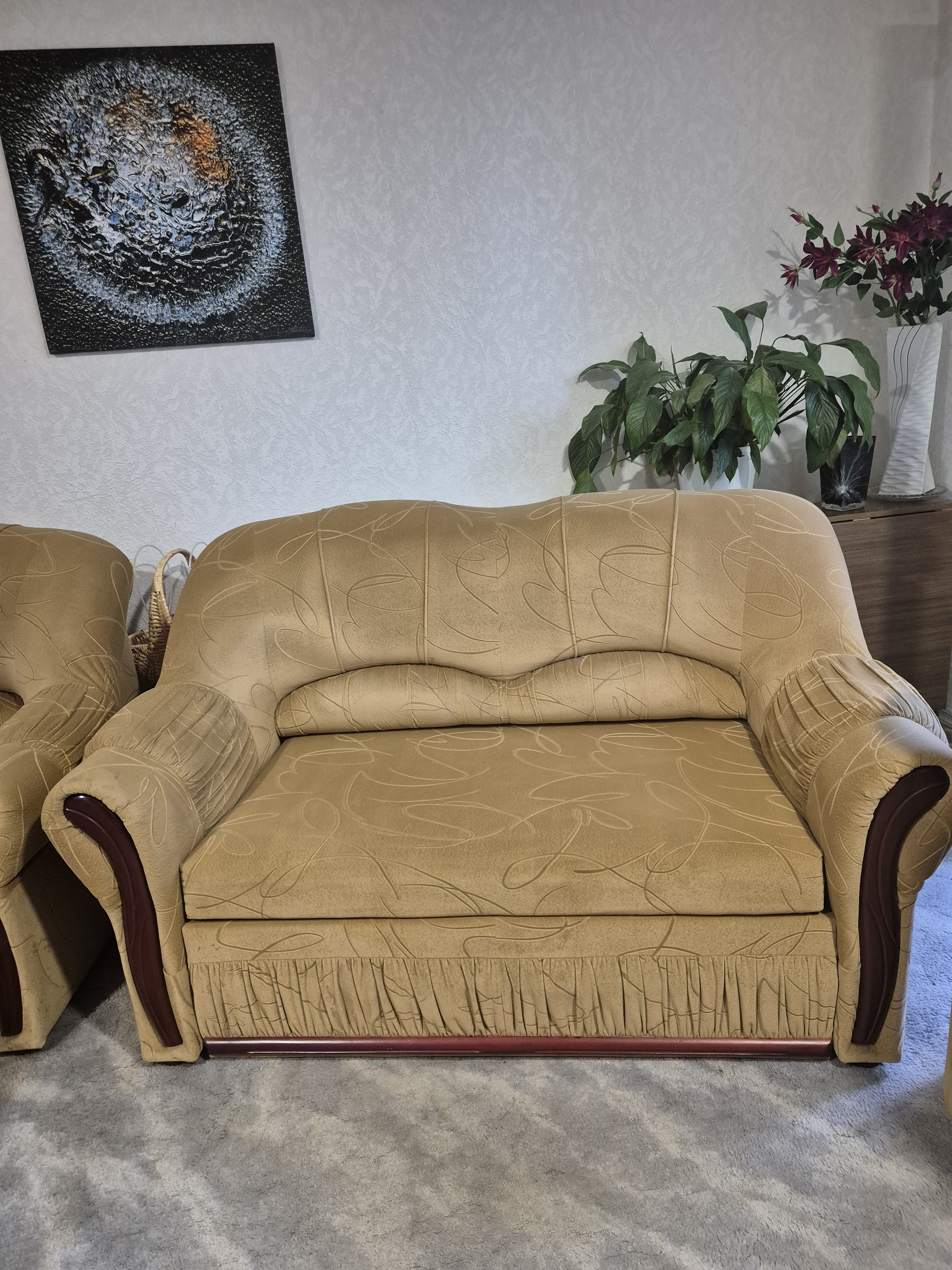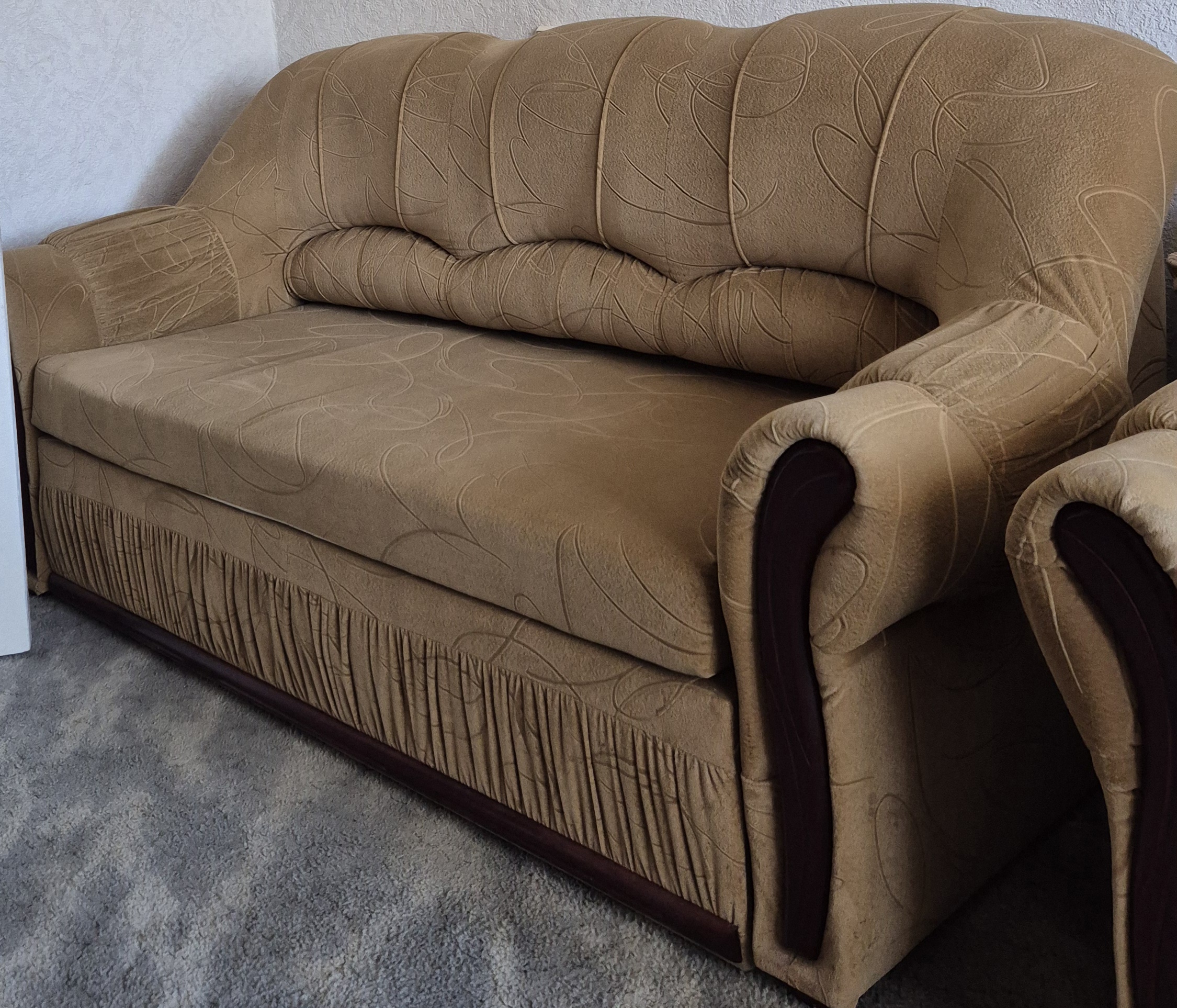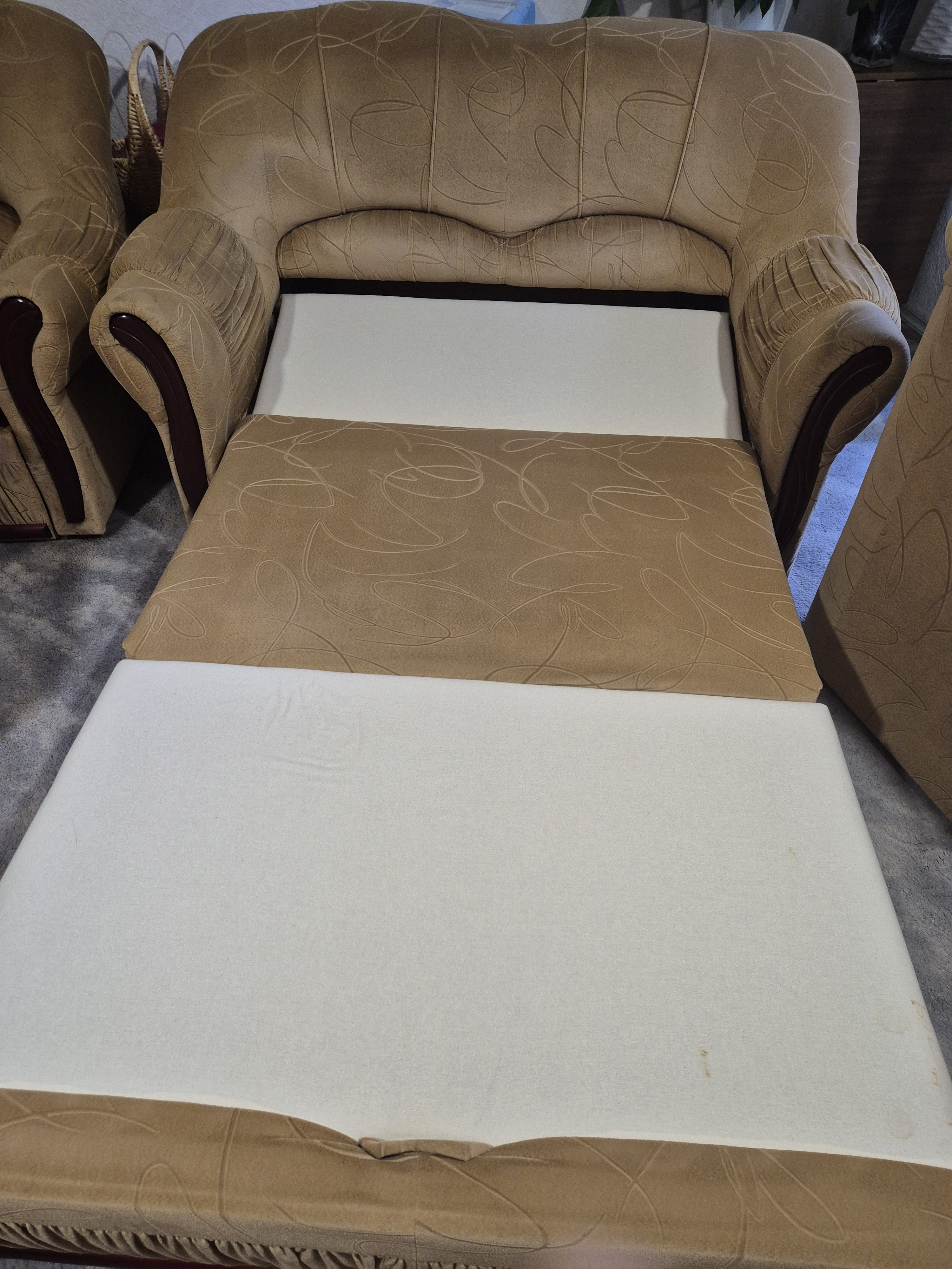 Naudotą svetainės baldų komplektą 3+2+1. Visos dalys išskleidžiamos (turi miegojimo funkciją), švarus, kokybiškas komplektas. Galima pirkti dalimis. Kaina sutartinė