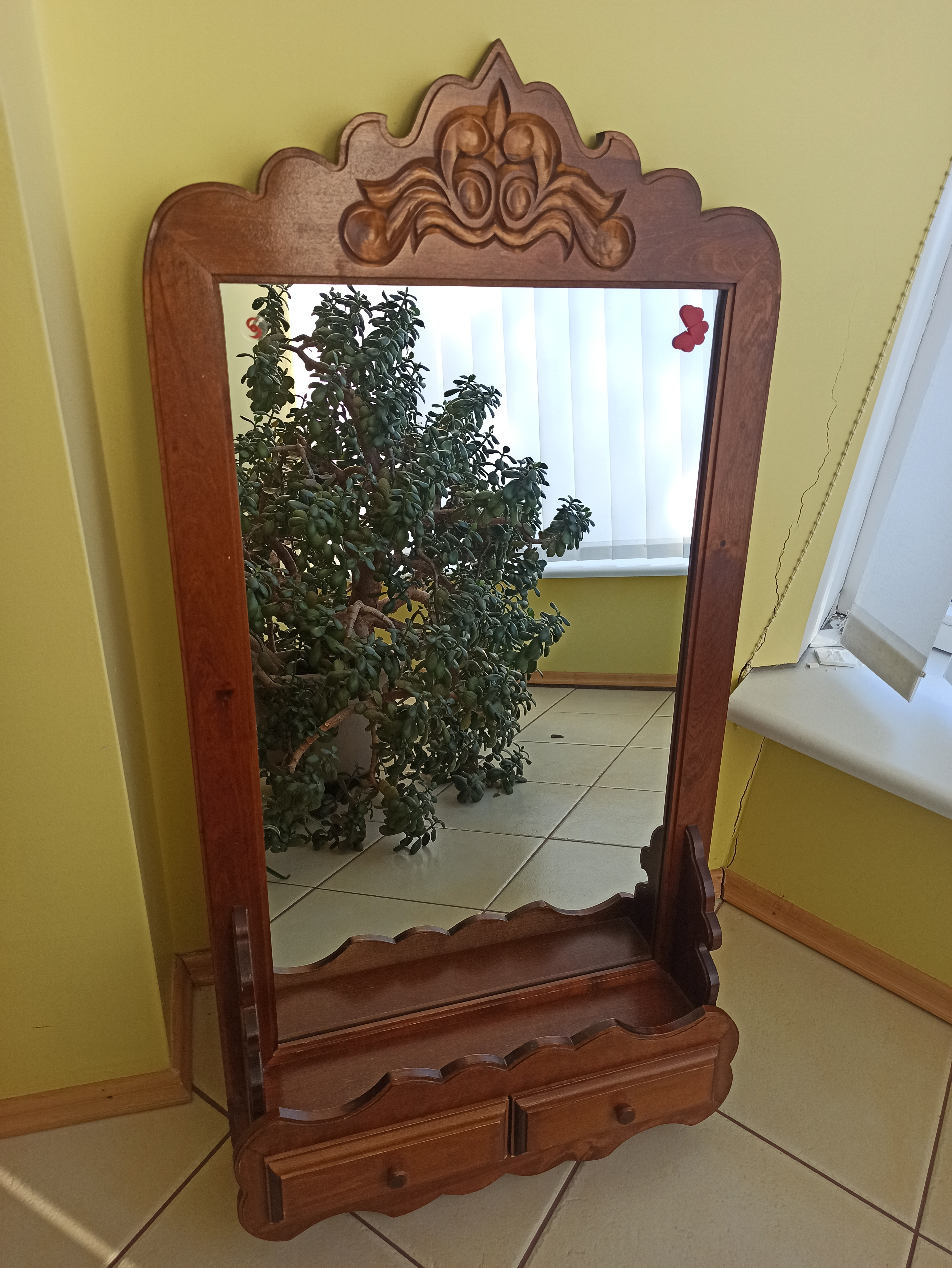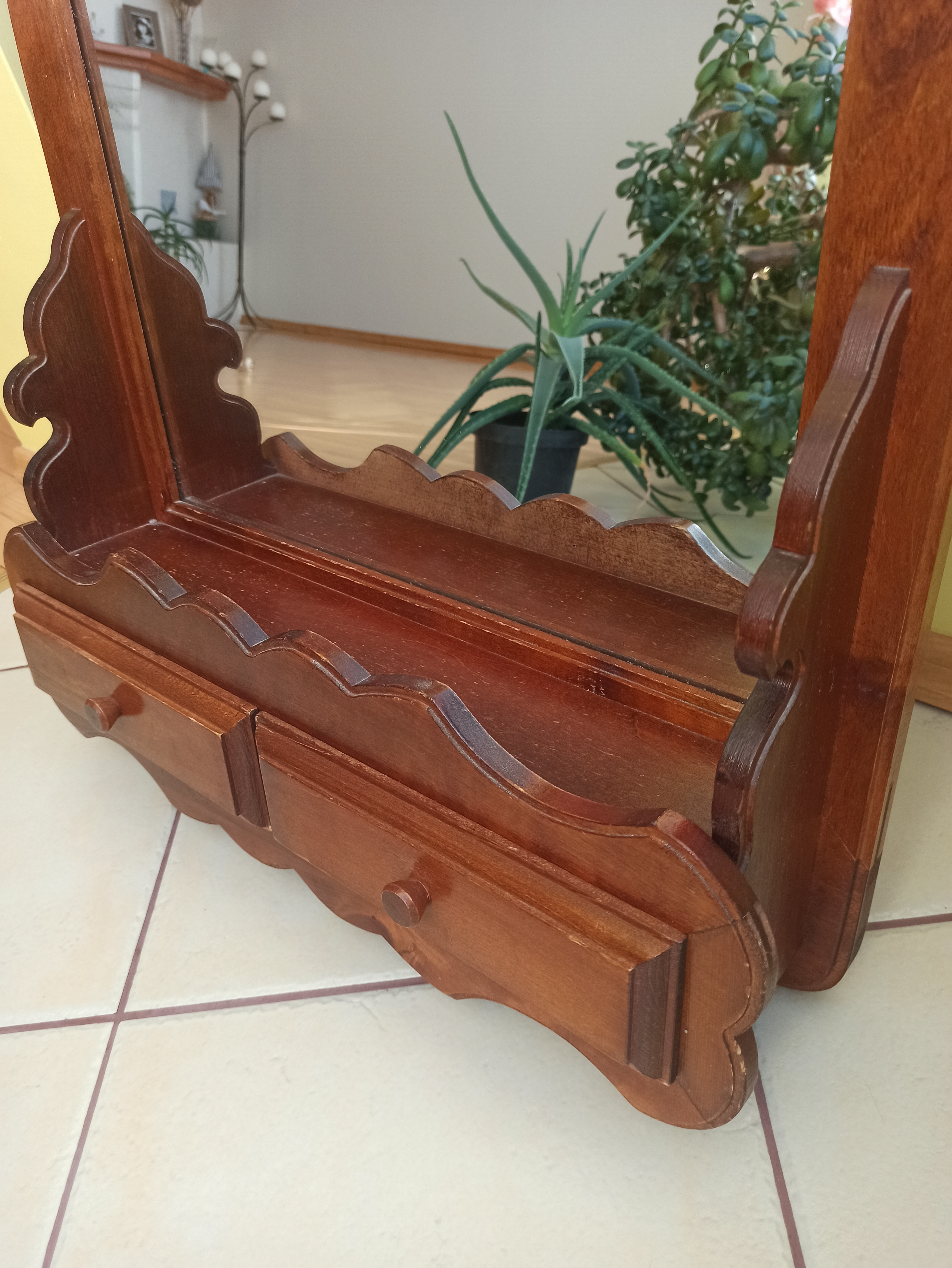 Pakabinamą veidrodį mediniu rėmu su dviem stalčiais, 105x55 cm
