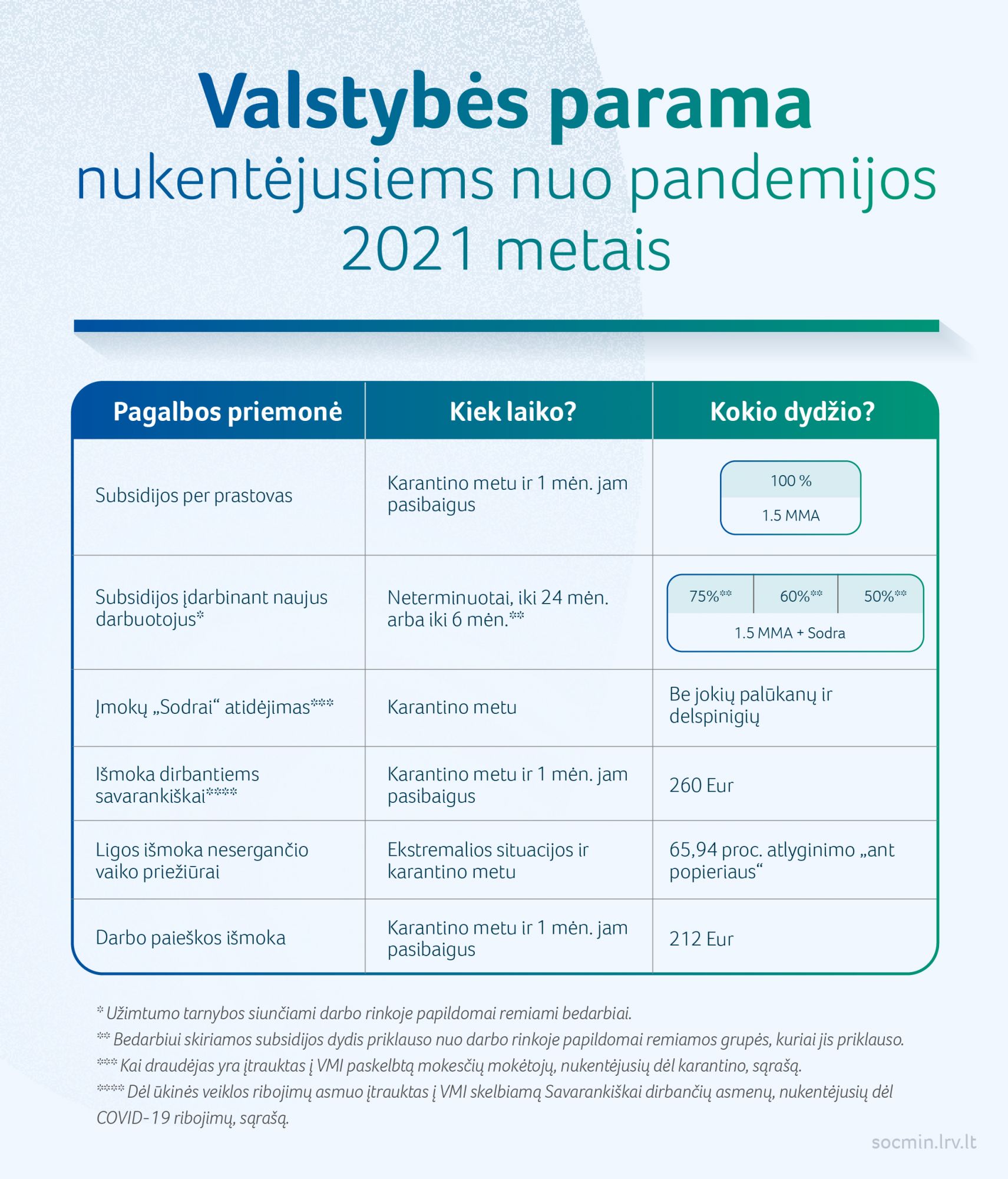 Pandemijai tęsiantis darbdaviai, darbuotojai, nepasiturintys gyventojai, būtinybei atsiradus mažus ar negalią turinčius vaikus namuose prižiūrintys tėvai ir kitais metais galės naudotis valstybės pagalbos priemonėmis. Socialinės apsaugos ir darbo ministerija primena, kokios valstybės paramos nuo pandemijos nukentėję šalies gyventojai sulauks kitąmet.