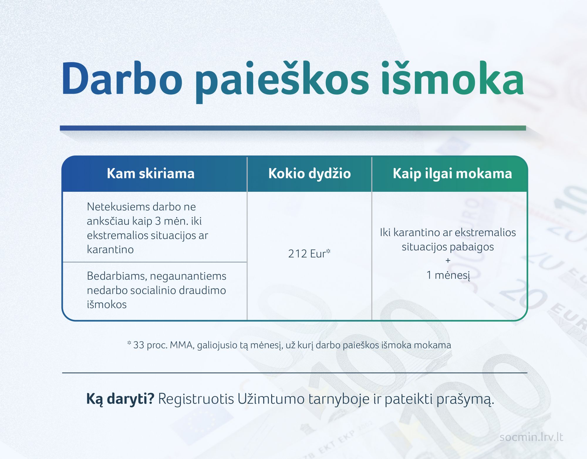 Atšaukus ekstremaliąją situaciją ar karantiną, darbo paieškos išmoka bus mokama dar 1 mėnesį. Darbo paieškos išmoka 2021 metais sieks 212 eurų.