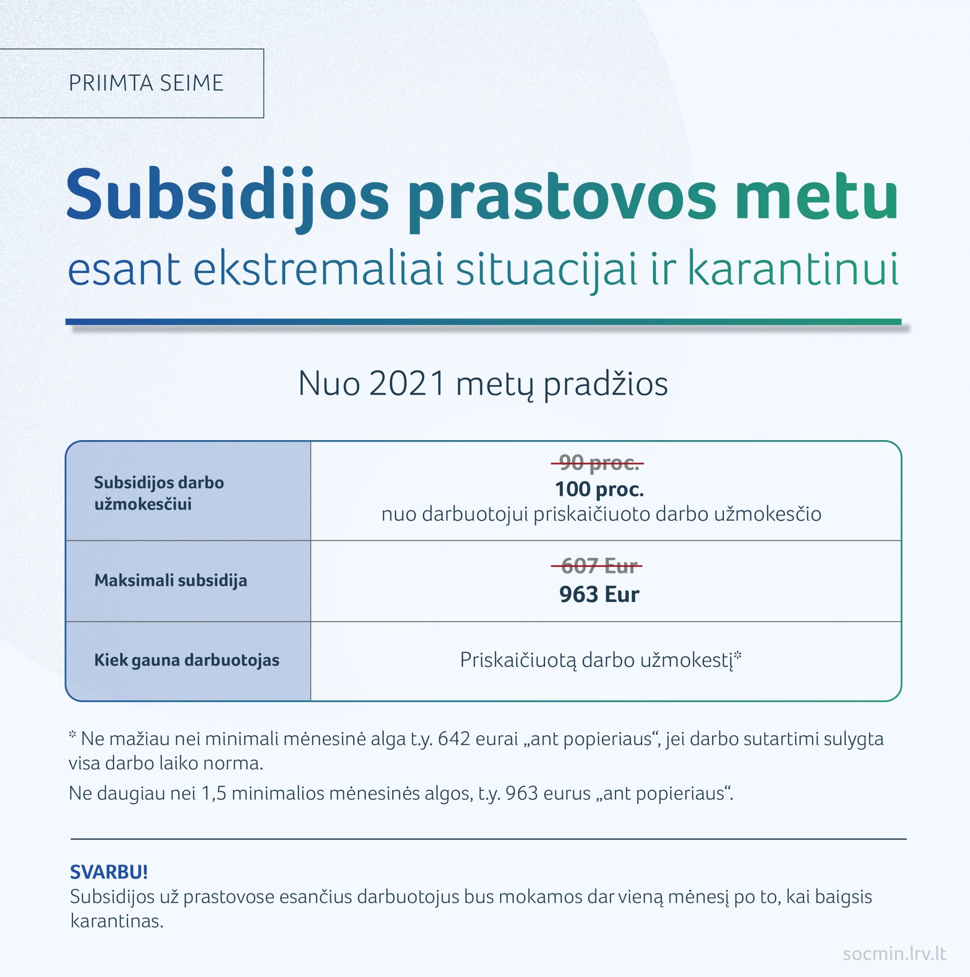 Nuo 2021 metų darbdaviams už prastovose esančius darbuotojus bus kompensuojamas visas (100 proc.) prastovų metu darbuotojui priskaičiuotas ir išmokamas darbo užmokestis. Maksimalus kompensuojamas dydis sieks 1,5 minimalios mėnesinės algos, t. y. 963 eurus „ant popieriaus“. Tačiau kompensuojama suma negalės būti didesnė nei darbo sutartyje nustatytas darbo užmokestis iki antro karantino paskelbimo dienos.