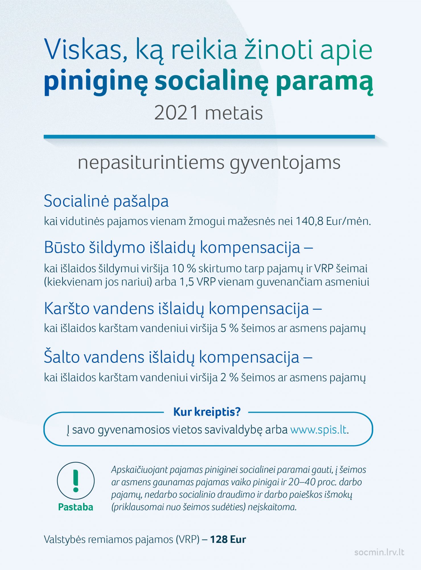 PINIGINĖ SOCIALINĖ PARAMA NEPASITURINTIEMS. Su finansiniais sunkumais susidūręs asmuo ar šeima į savo savivaldybę gali kreiptis piniginės socialinės paramos: socialinės pašalpos, būsto šildymo ir vandens išlaidų kompensacijų. 2021 metais teisę į socialinę pašalpą įgis asmenys, kurių vidutinės mėnesio pajamos asmeniui neviršys 140,8 eurų.