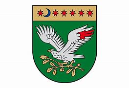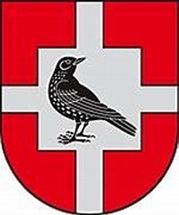 Sidabrinis kryžius raudoname lauke su sidabriniu kvadratu centre, o kvadrate tupintis ir atgal žvelgiantis juodas strazdas.