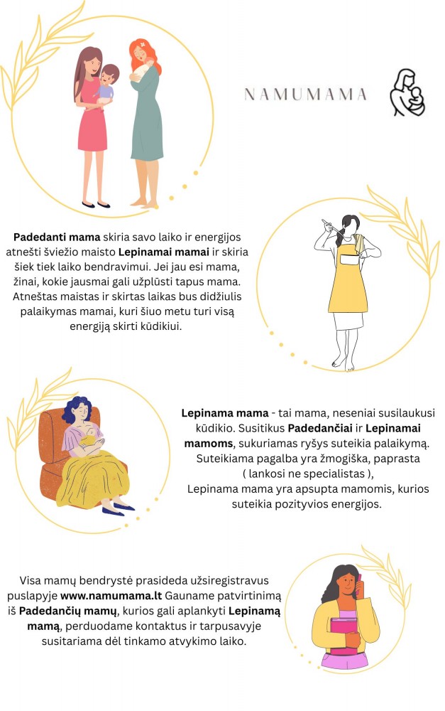 Namų mama yra mamų bendruomenė, kurioje jau esančios mamos padeda besilaukiančioms ar ką tik pagimdžiusioms mamoms (atneša šviežio maisto ir skiria šiek tiek laiko bendravimui). Iniciatyva veikia nuo gruodžio mėnesio visoje Lietuvoje savanoriškais pagrindais ir tai yra ne specialistų teikiama pagalba.