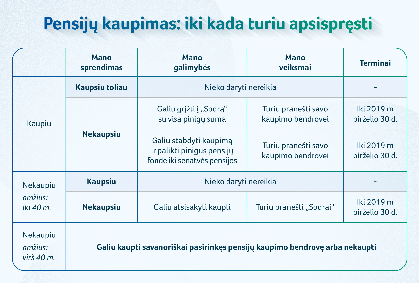 - Jeigu šiuo metu kaupiantis dirbantysis norės atsisakyti kaupti – apie sprendimą jam reikės pranešti savo kaupimo bendrovei iki 2019 m. birželio 30 d.