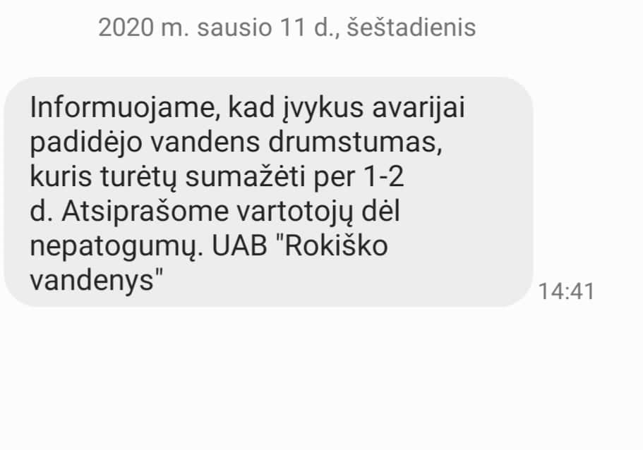 Rokiškėnai, „Rokiškio vandenų“ abonementai, gavo trumpąsias žinutes, kad įvykus vandentiekio avarijai, bus 1-2 dienas padidėjęs vandens drumstumas.