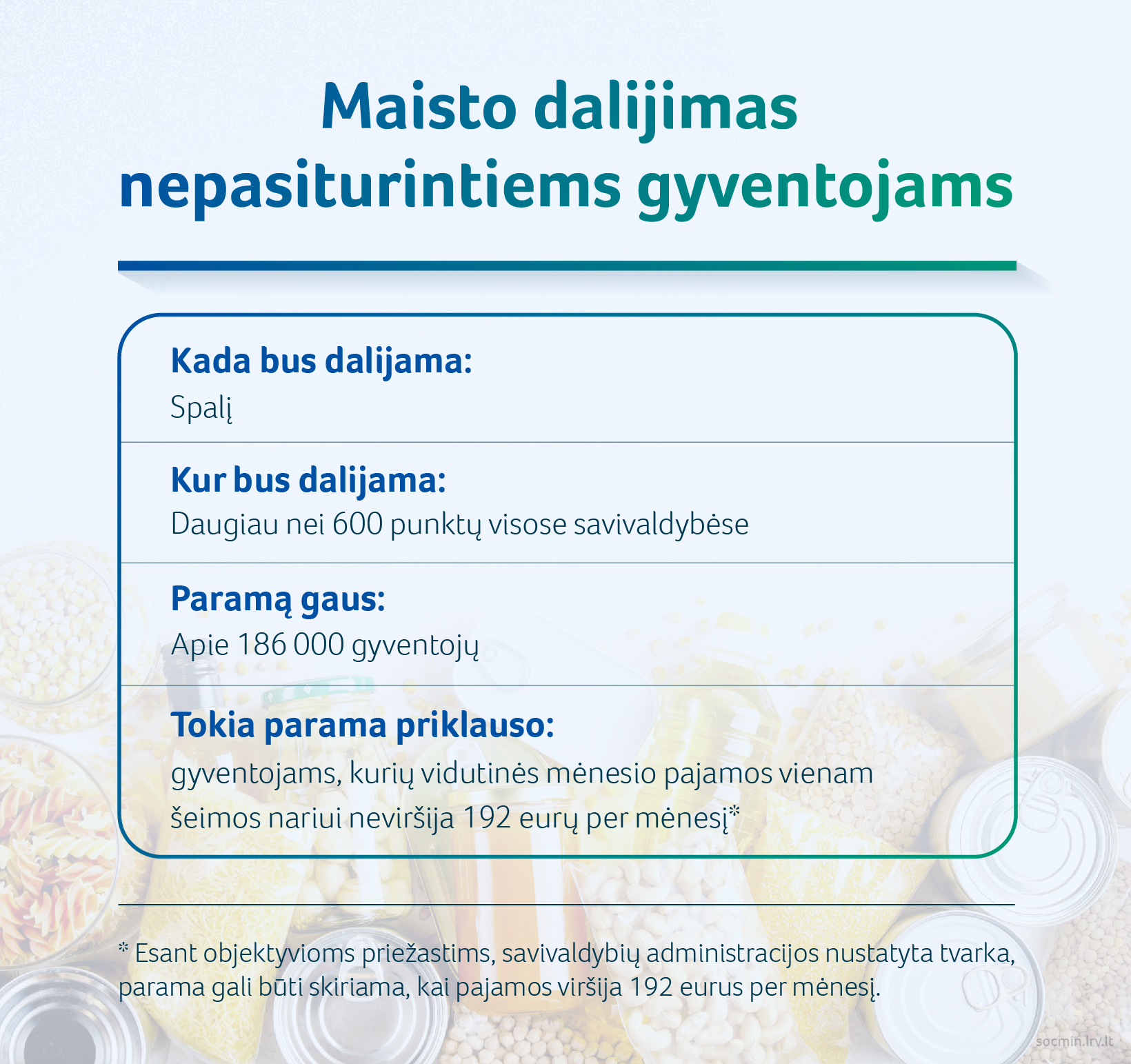 Nuo spalio 11 d. nepasiturinčius šalies gyventojus pasieks šiais metais jau penktoji pagalba maisto produktais. Paskutinis dalijimas šiemet dar vyks gruodį. Maistas nepasiturinčius šiemet jau pasiekė vasario, balandžio, birželio ir rugpjūčio mėnesiais.