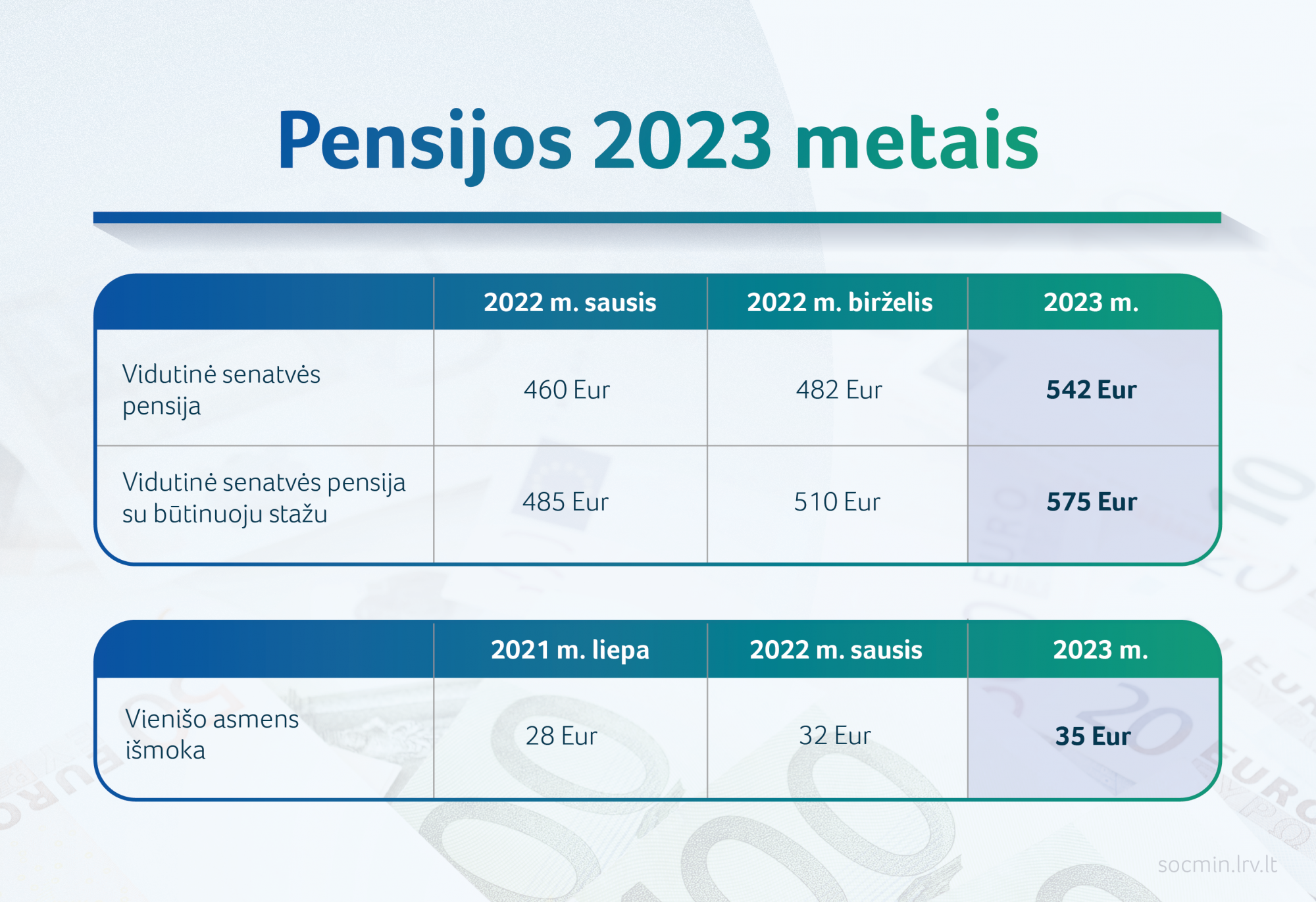 PENSIJOS. Vidutinė senatvės pensija kitąmet didės nuo 482 eurų iki 542 eurų. Vidutinė senatvės pensija su būtinuoju stažu didės nuo 510 iki 575 eurų. Bendroji pensijos dalis 2023 m. didės apie 9 proc., o individualioji – beveik 15 proc. Nuo kitų metų sausio mėnesio vidutinė pensija turint būtinąjį stažą vidutiniškai ūgtels daugiau nei 12 proc. arba 65 eurais. Pareigūnų ir karių bei teisėjų valstybinės pensijos nuo sausio 1 d. bus indeksuojamos 4,6 proc.