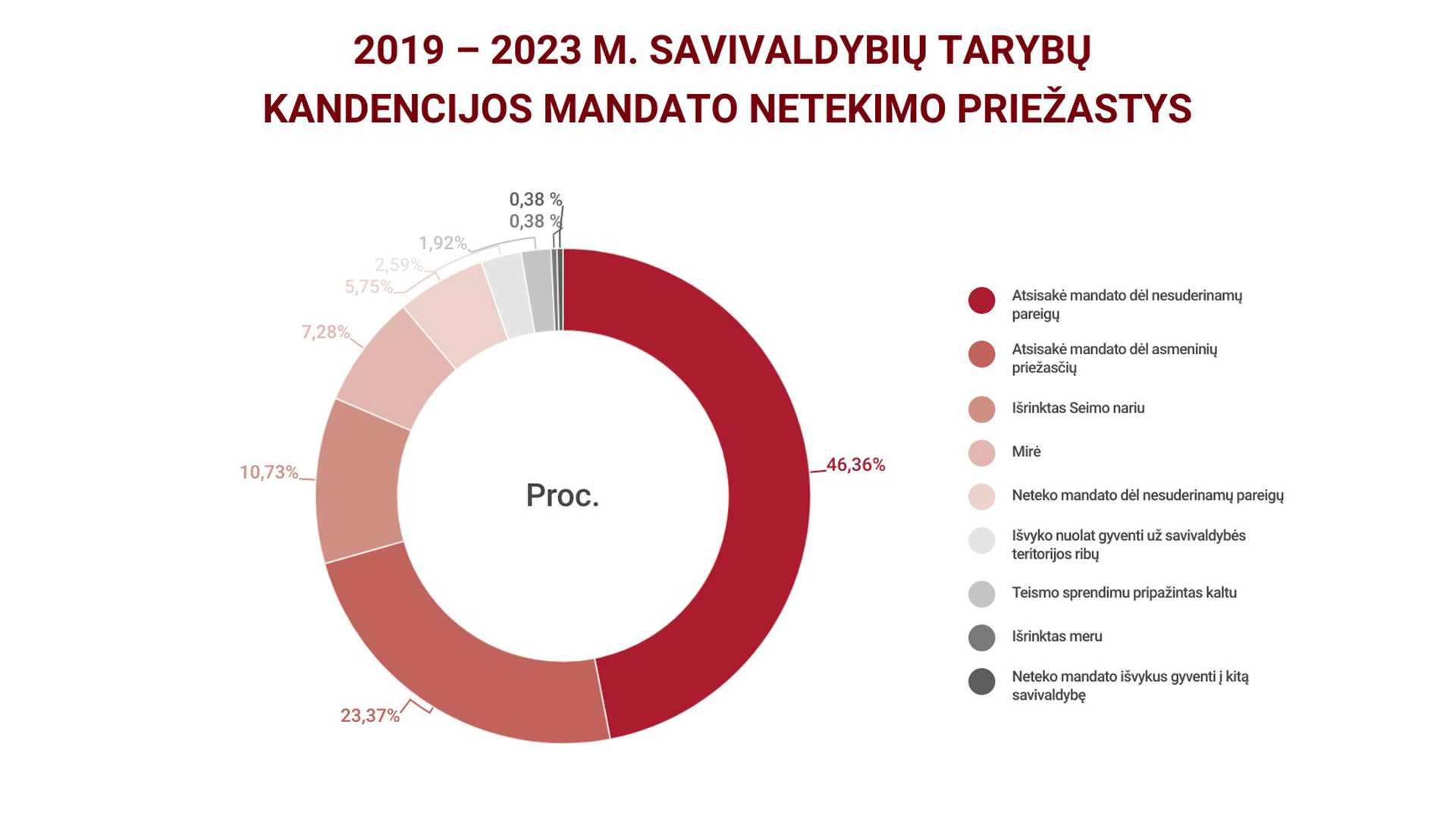 23,4 proc. savivaldybių tarybų narių atsisakė mandato dėl asmeninių priežasčių, o 10,7 proc. narių įgaliojimai nutrūko 2020 m. juos išrinkus į Lietuvos Respublikos Seimą.