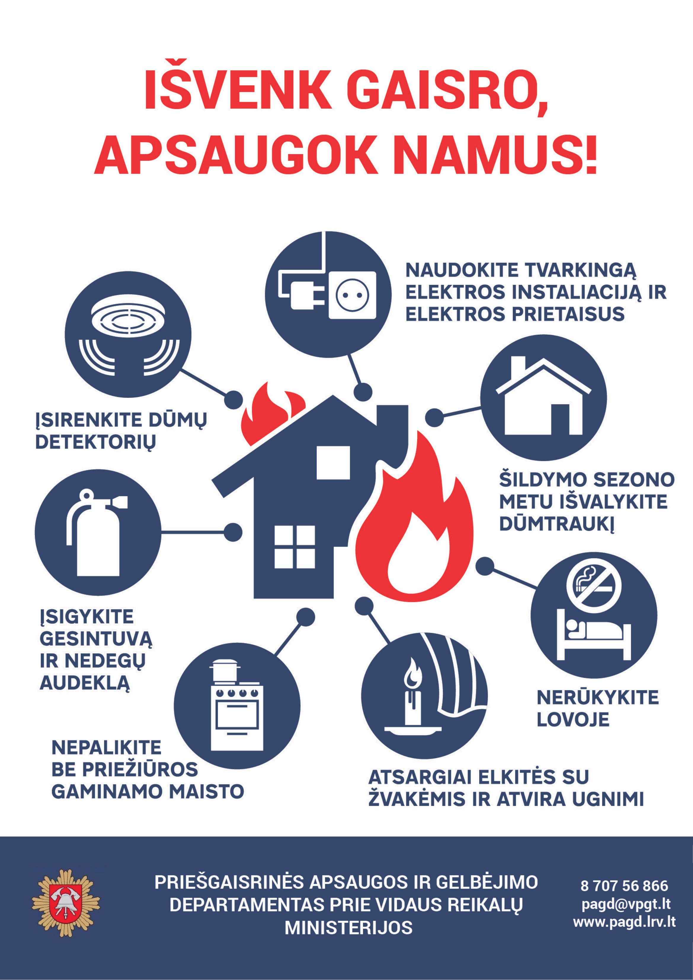 „Atsižvelgdami į didėjantį gaisrų bei juose žūstančių žmonių skaičių, norime įspėti gyventojus, kad laikytųsi priešgaisrinės saugos reikalavimų ir atkreiptų dėmesį į tinkamą kietojo kuro krosnių, dūmtraukių įrengimą ir naudojimą, elektros instaliaciją ir kitus įrenginius, dėl kurių gali kilti gaisras, – sako departamento direktoriaus pavaduotojas Giedrius Sakalinskas. – Kiekvienas iš mūsų privalome rūpintis savo ir artimųjų sveikata, gyvybe bei turtu. Pats paprasčiausias ir veiksmingiausiais būdas – namuose įsirengti dūmų detektorių. Būtent dūmų detektorius perspėja žmogų apie kilusį gaisrą ir gali apsaugoti nuo gresiančios nelaimės. Tuo labiau kad gaisrai dažniausiai kyla nakties metu, kai jų tikimasi mažiausiai.“