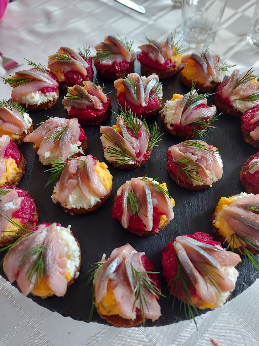 Su smulkesne burokine tarka sutarkuoti atskirai burokėlius, kiaušinio baltymą, kiaušinio trynį, mases gardinti druska, pipirais, majonezu. Burokėlius pagardinti actu ar citrinos sulčių šlakeliu. Ant pakepintų ir formele išspaustų ir pakepintų duonos riekelių tepti tris skirtingų spalvų mases, ant viršaus dėti silkės griežinėlius, puošti krapu ar raudonuoju svogūnu.