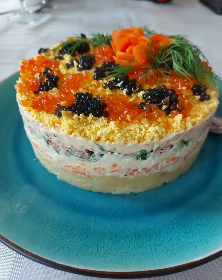 3-4 virtos bulvės, virta vidutinio didumo morka, 3 virti kiaušiniai, konservuotas tunas (skardinė), sintetinių ikrų užtepėlė, majonezas, ikriukai, svogūnų laiškai žalumynai, druska, pipirai.