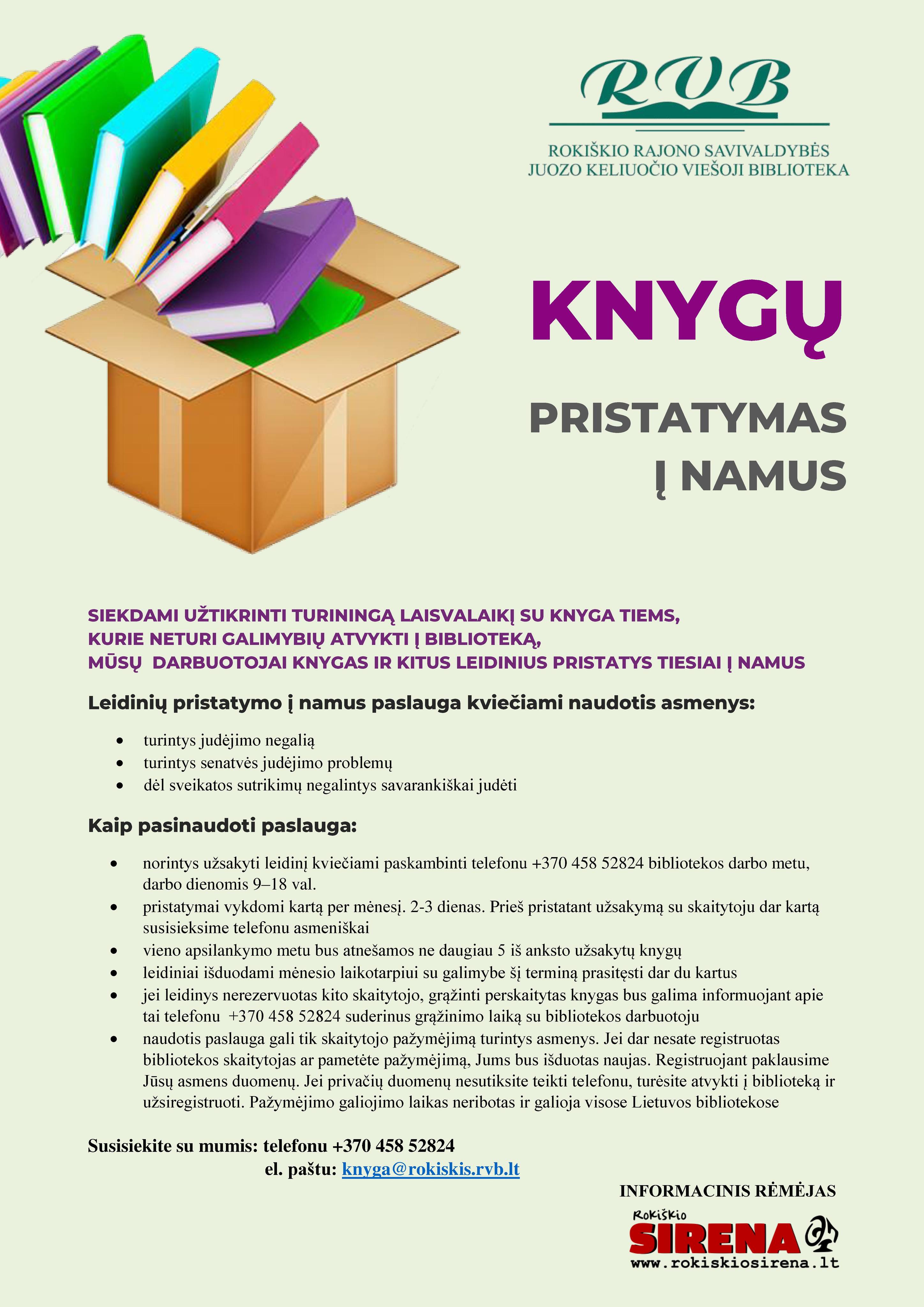Rokiškio rajono savivaldybės Juozo Keliuočio viešosios bibliotekos kolektyvas primena – bibliotekoje veikia knygų pristatymo į namus paslauga. Bibliotekininkės juokauja, kad tai – kaip maisto į namus paslauga, tik šiuo atveju maitinasi siela ir protas.