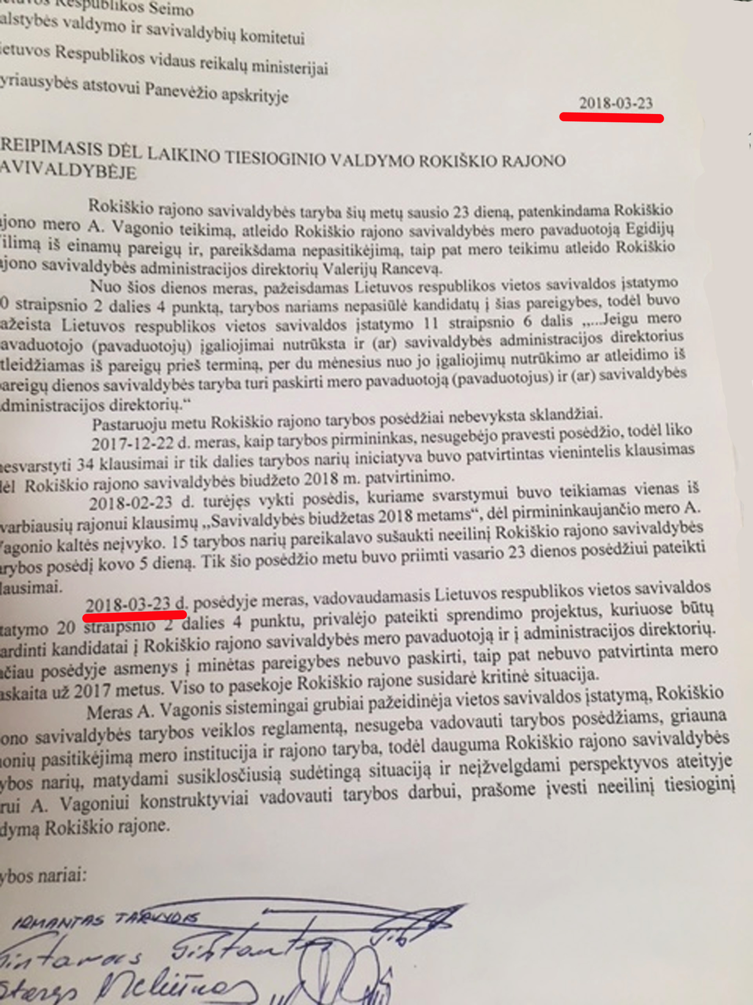 Šį raštą ketvirtadienį, kovo 22 d. apie 13 val. į „Rokiškio Sirenos“ redakciją atsiuntė rajono meras Antanas Vagonis. Raštas datuotas kovo 23 d. Jame dieną prieš rajono tarybos posėdį buvo numatyta, kad nebus patvirtinta mero veiklos ataskaita.