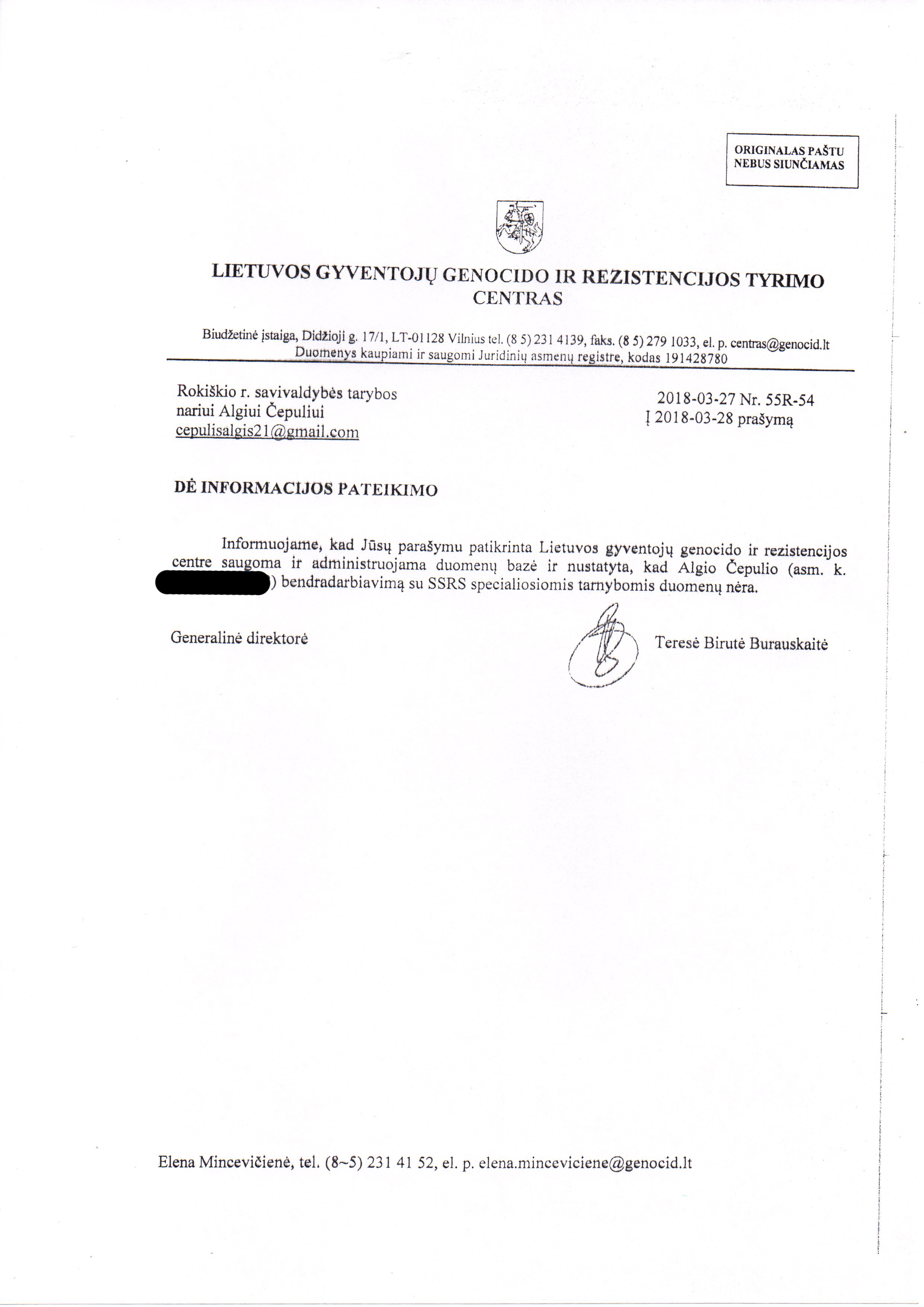 - Kiekvienas Rokiškio rajono savivaldybės Tarybos narys kreipiasi į Lietuvos gyventojų genocido ir rezistencijos tyrimų centrą, dėl pažymos išdavimo apie asmens (Rokiškio raj. savivaldybės tarybos nario) nebendradarbiavimą su SSRS specialiosiomis tarnybomis. Įvykdymo terminas iki 2018- 05-25 (pvz. Rokiškio raj. tarybos nario Algio Čepulio, pridedamas)