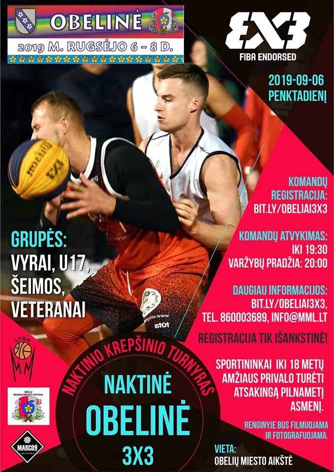 Rugsėjo 6-8 dienomis Obelių miestelyje (Rokiškio raj.) šurmuliuos tradicinė miestelio šventė Obelinė, jos metu krepšinio mėgėjus kviečiame dalyvauti ir 3x3 naktinio krepšinio turnyre. Krepšinio turnyras vyks penktadienį, rugsėjo 6, vakare nuo 20:00 val. Registracija jau vyksta!