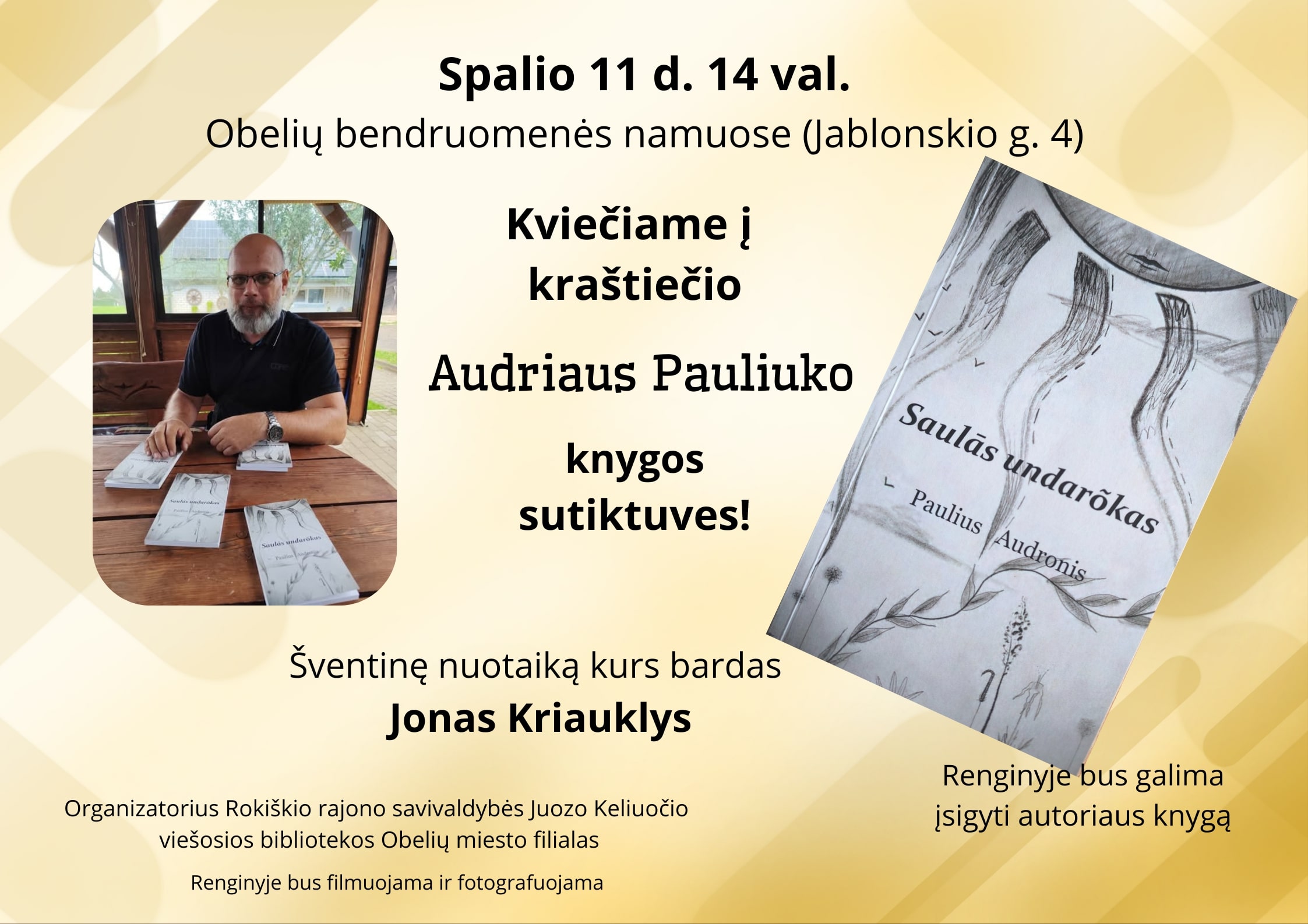 Spalio 11 d. 14 val. Obelių bendruomenės namuose (Jablonskio g. 4) vyks literatūrinis renginys – kraštiečio Audriaus Pauliuko knygos „Saulas undarokas“ pristatymas.