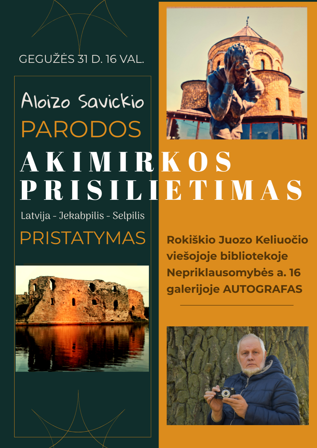 Gegužės 31 d. 16 val. Rokiškio Juozo Keliuočio viešojoje bibliotekoje vyks gegužės mėnesį eksponuotos Aloizo Savickio Foto parodos „Akimirkos prisilietimas" (Latvija–Jekabpilis–Selpilis) pristatymas. Dalyvauja autorius.