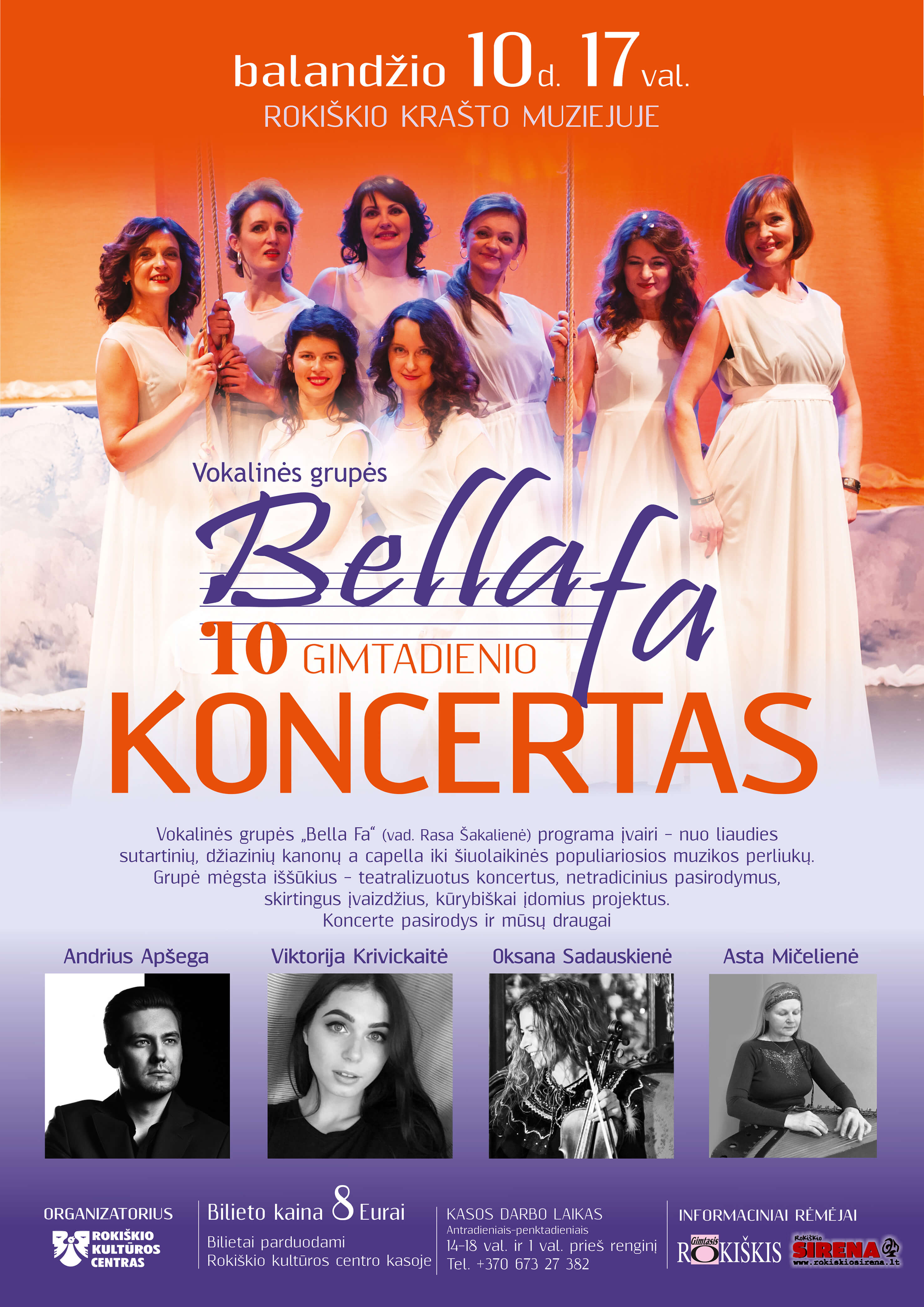 Vokalinė grupė BELLA FA savo veiklos metus skaičiuoja nuo 2012 metų balandžio 10 d., tad būtent šią dieną 17 val. kviečia į koncertą Rokiškio krašto muziejuje, kartu paminėti 10-ąjį Gimtadienį.