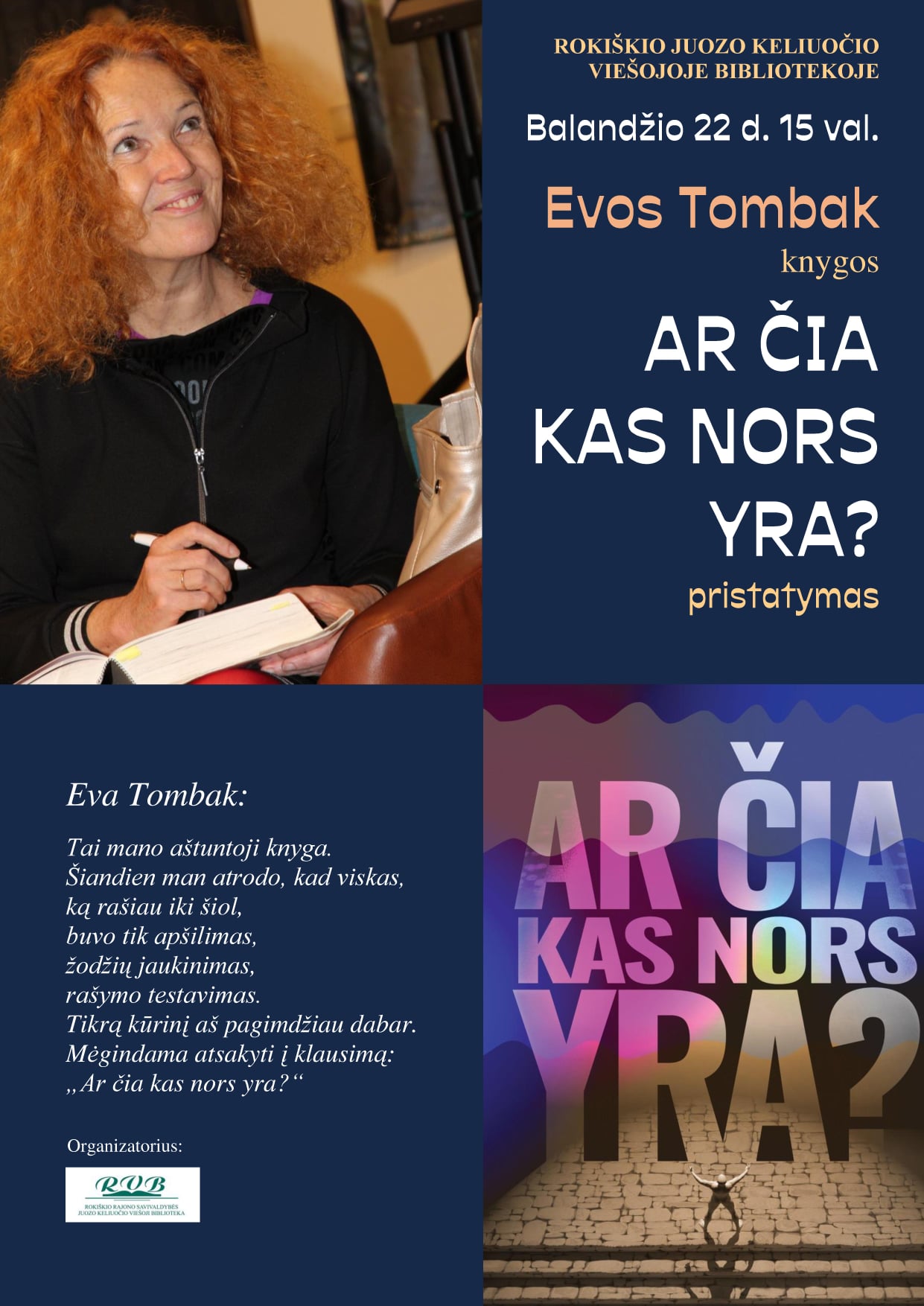 Balandžio 22 d. 15 val. Rokiškio rajono savivaldybės Juozo Keliuočio viešojoje bibliotekoje Evos Tombak knygos „Ar čia kas nors yra?“ pristatymas.
