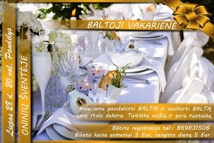 Liepos 28 d., 20 val. kviečiame į Baltąją vakarienę Pandėlyje. Tai galimybė pasibūti kartu su draugų kompanija, giminėmis, tėvais, vaikais, seneliais, anūkais, malonioje aplinkoje pasižiūrėti koncertą. Registruojantis reikia nurodyti dalyvausiančių žmonių skaičių el. paštu j.baguziene@gmail.com arba tel. 8 651 25115, 8 698 31506 – Jūratė, 8 696 44 267 – Renata. Surinktos lėšos bus parama renginiui.