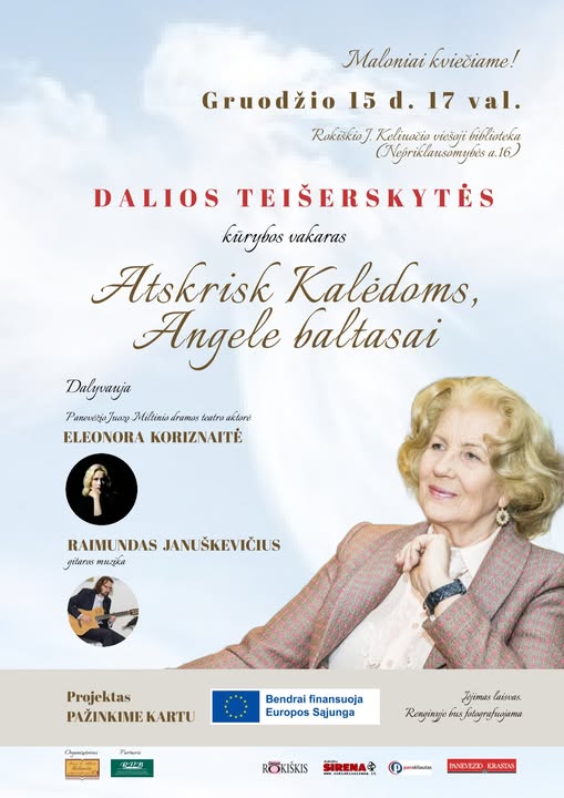 Maloniai kviečiame į jaukų ir šventišką literatūros vakarą „Atskrisk Kalėdoms, Angele baltasai“, skirtą Dalios Teišerskytės kūrybai. Renginys vyks gruodžio 15 d. 17 val. Rokiškio J. Keliuočio viešojoje bibliotekoje (Nepriklausomybės a. 16).