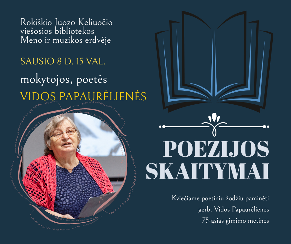 Sausio 8 d. 15 val. Rokiškio Juozo Keliuočio viešojoje bibliotekoje - mokytojos, poetės Vidos Papaurėlienės poezijos skaitymai, skirti poetės 75-sioms gimimo metinėms paminėti.