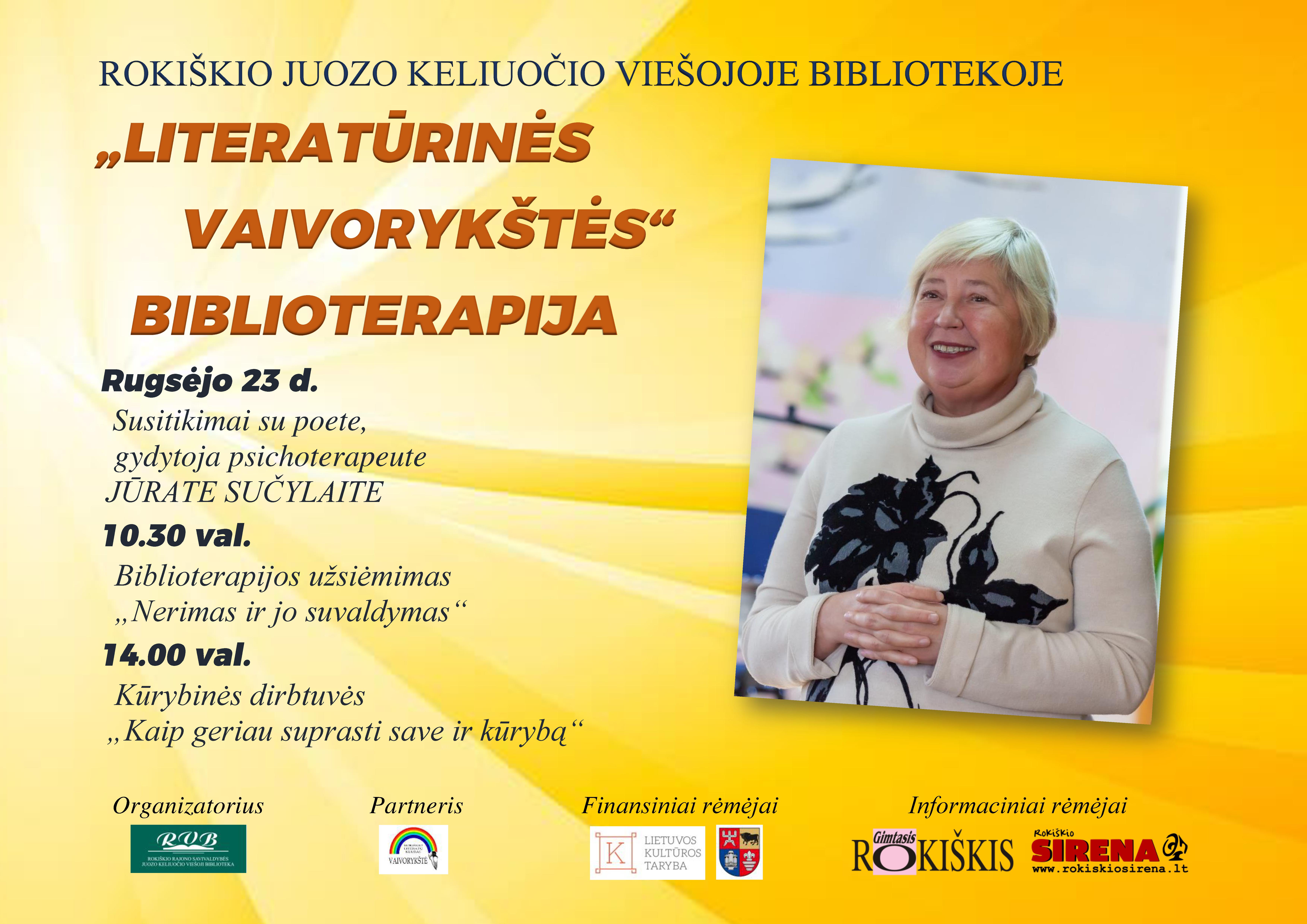 Rugsėjo 23 d.– Rokiškio J. Keliuočio viešojoje bibliotekoje vyks susitikimai su poete, gydytoja psichoterapeute Jūrate Sučylaite: