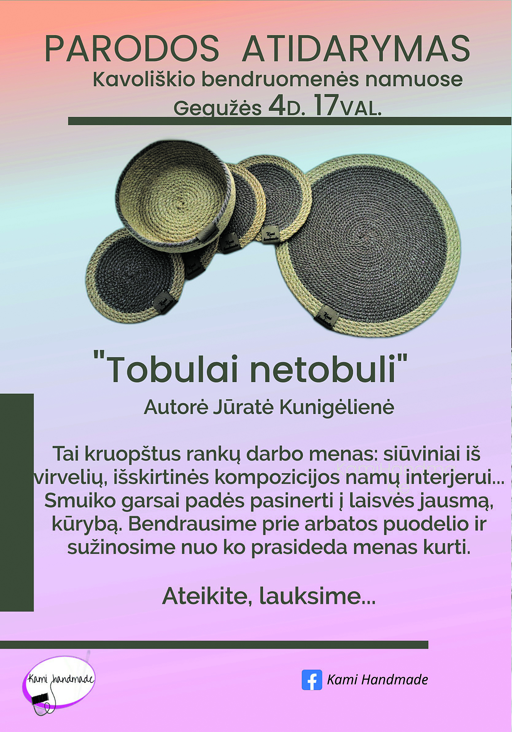 Gegužės 4 d. 17 val., Kavoliškio bendruomenės namuose Jūratės Kunigėlienės parodos atidarymas „Tobulai netobuli“.