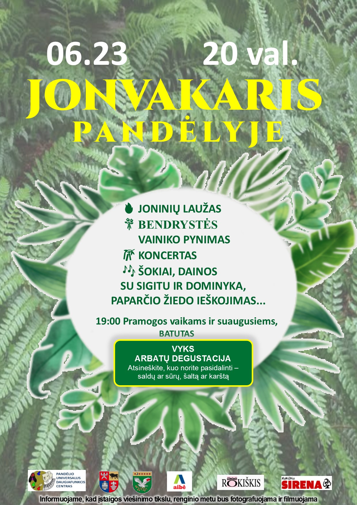Jonvakaris Pandėlio kultūros namuose (Vytauto a. 11) vyks birželio 23 d. 20 val. Jūsų laukia tradiciniai joninių laužai, koncertas, šokiai ir pramogos vaikams. Kviečiame dalyvauti ilgiausio vainiko pynime, ieškoti paparčio žiedo, ragauti lietuviškų žolelių arbatas ir suneštines vaišes.