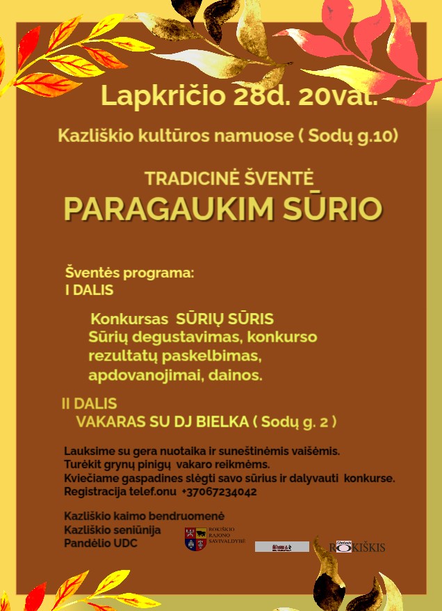 Lapkričio 28 d. 20 val. Kazliškyje vyks jau tradicija tapusi šventė „Paragaukim sūrio“, kviečianti visus sūrių mėgėjus, smalsuolius ir linksmų vakarų išsiilgusius žmones susiburti Kazliškio kultūros namuose (Sodų g. 10).